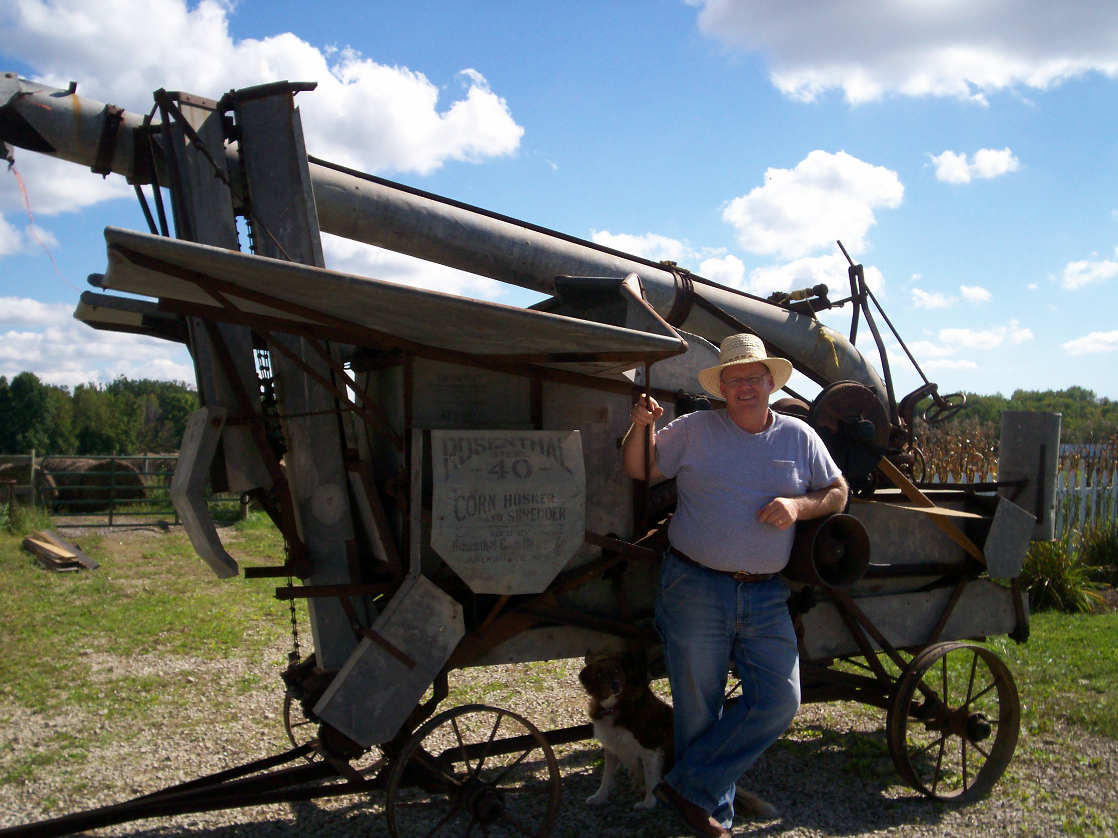 The Husker/Shredder in the photo is an old fashioned piece of farm equipment that takes the whole corn plant, husks the ears from the stalk, then shreds the stalk and husk into small pieces like mulch. The ears of corn are stored in a crib while the shredded plant is blown into the upper part of my barn or into a pile where the animals rip through it eating what the want and using the rest for bedding. The bedding and manure makes its way to a large composting area to rot down and cook. The compost is then applied to our fields when conditions are right.