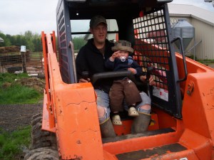 My grandson and his daddy were here to spend a day on the farm. Mom and sister were here too. They all had fun fishing, walking in the very wet woods, cleaning up around the old cabin and of course helping with chores. Little boys (and big boys) love tractors and skidsteers.