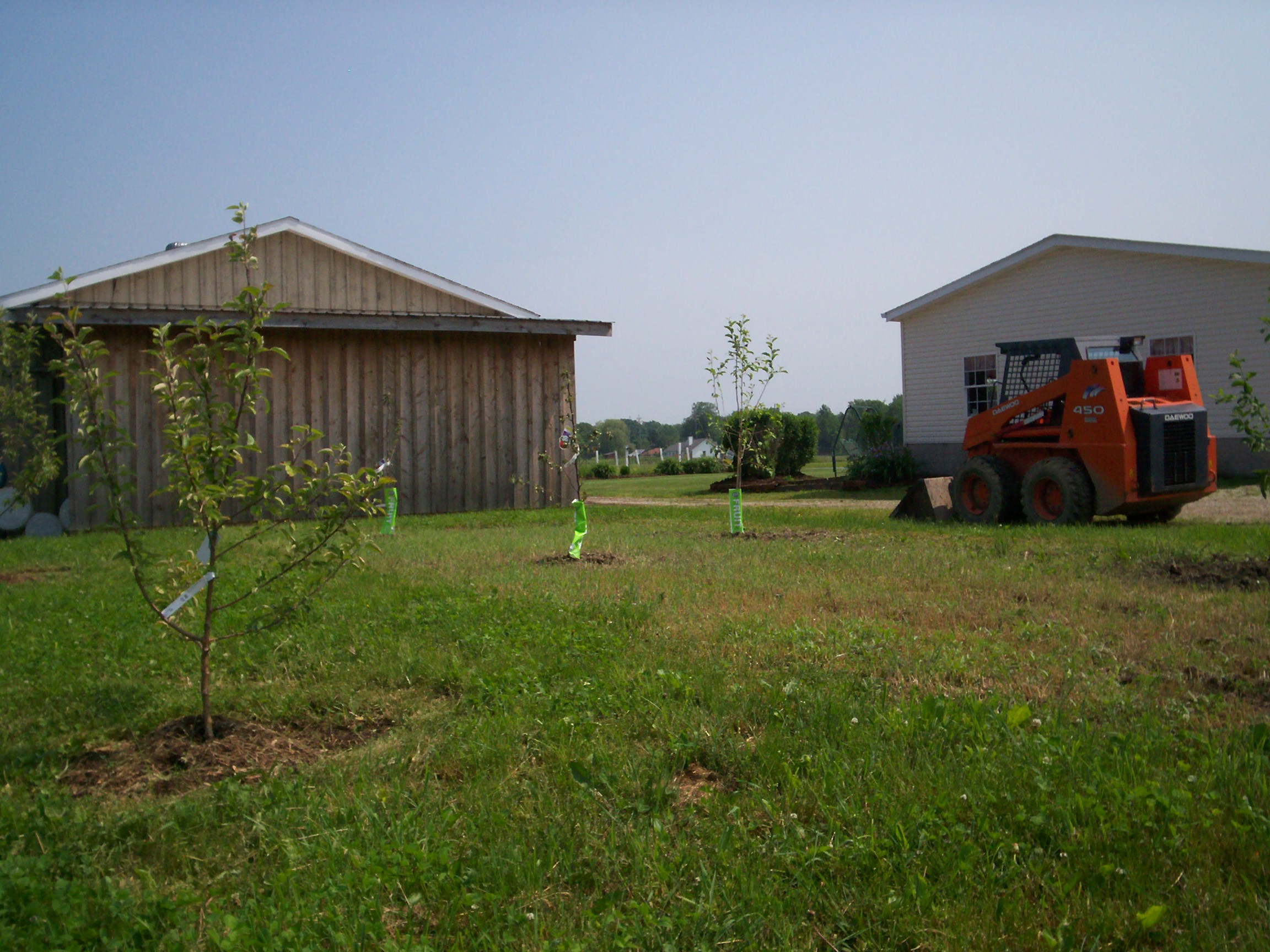 Some of the trees had a few broken branches. All of them needed a drink and they all needed planted. Their containers were broken or torn, but looking past the flaws, I could see five very nice young apple trees. We bought them for under $12.00 a piece. They now make up our small orchard. We had two trees planted there from last year, but now have an orchard 😮