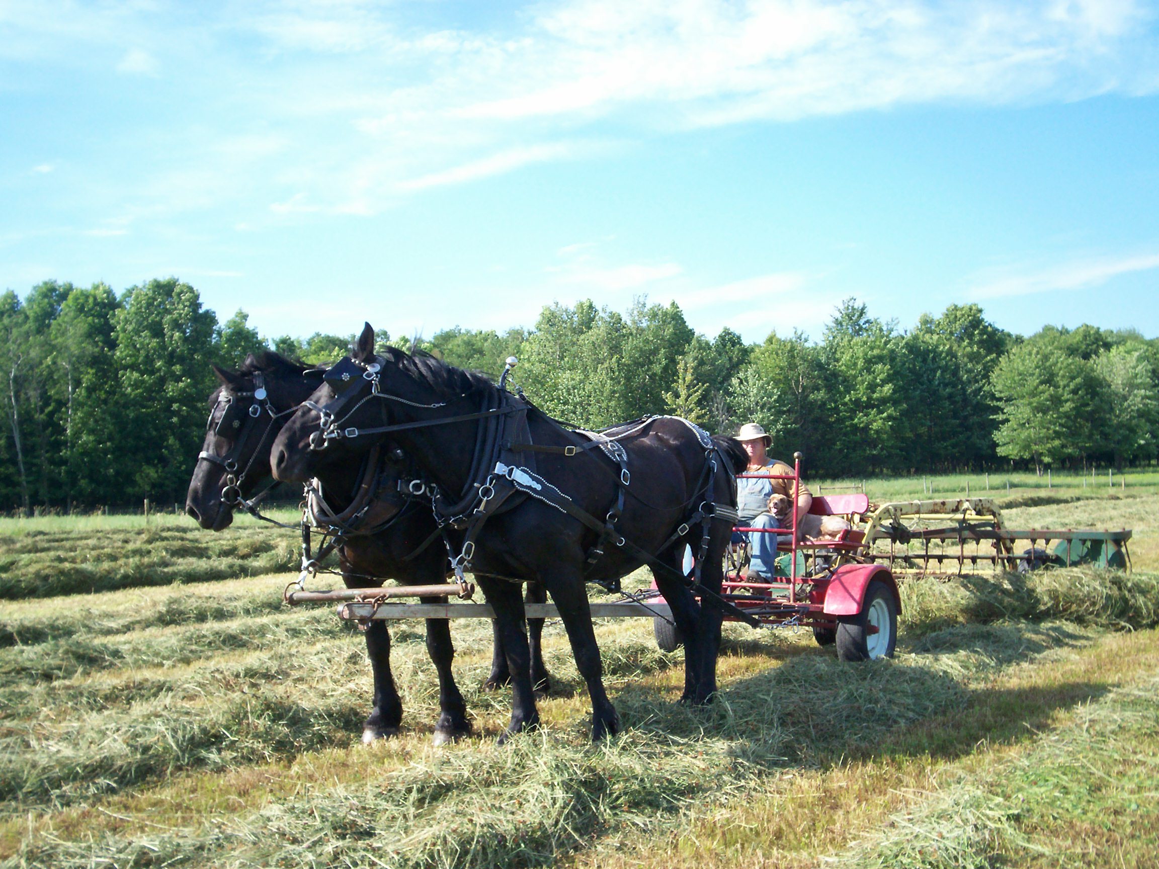 This is a photo from last season. I was raking hay. I stopped to rest the horses and Lucy came for a visit. I like working horses for just such reasons. You can hear the birds sing, the hay sliding off the rake and the creaks and jingles of the harness. There are no fumes … well not diesel fumes anyway 😮 Really you can smell the horses and the fresh-cut hay as all your senses get involved in your farming.