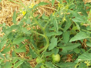 Tomatoes are beginning to grow on the vines. The plants were mulched with straw to help keep the soil moist. The moisture keeps nutrients moving up the plants. The much-needed calcium makes everything else available to the growing and ripening fruit. The lack of calcium causes blossom end rot where a perfectly formed tomato has a rotted bottom on it… all for the lack of calcium caused by the lack of moisture. The straw is an easy fix that also helps smother weeds.