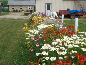 The garden border is magnificent. It is a perennial border of daisies, day lilies and cone flowers. I moved these plants here a couple of years ago when we needed to split plants and had no place in mind to plant them. We are so very happy that we did. These are beautiful every year, require very little maintenance and they were free 😮 The flower border mimics the plantings around our house. I have even started planting in front of our pig barn.