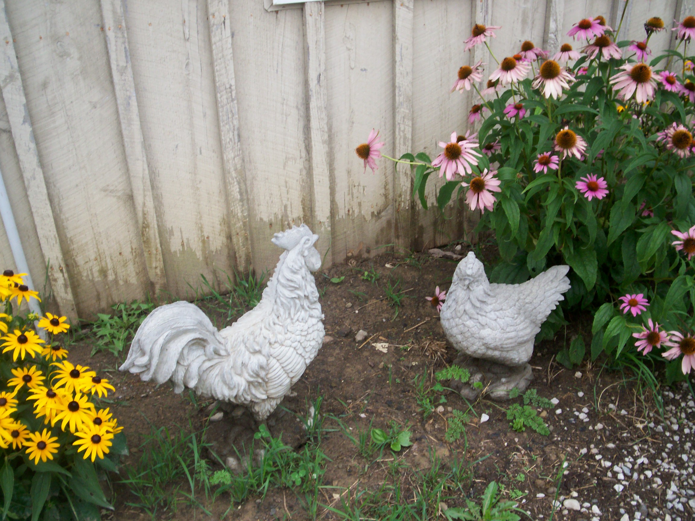 The cement chickens look good and even kind of cute in the flower bed, but cement sweet corn? Give me a break!
