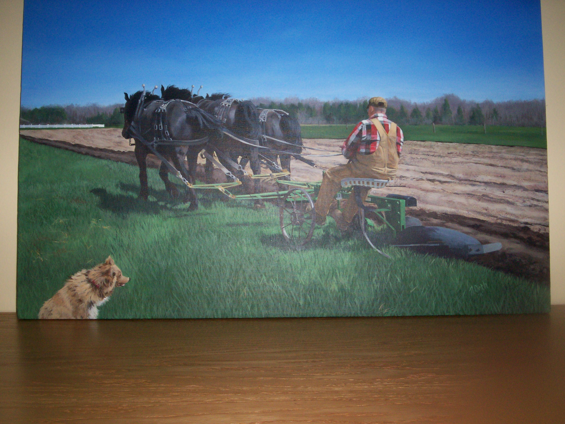 This painting was done by a lady that I used to work with. She painted it from a photograph. My dog in the photo died while she was painting the picture of me plowing. She had never seen the dog alive. She drew the dog into the painting from a different picture. The details in the painting are spot on. I am in amazement that anyone has this kind of talent. Thank you Nancy, for a picture worth well beyond a thousand words.