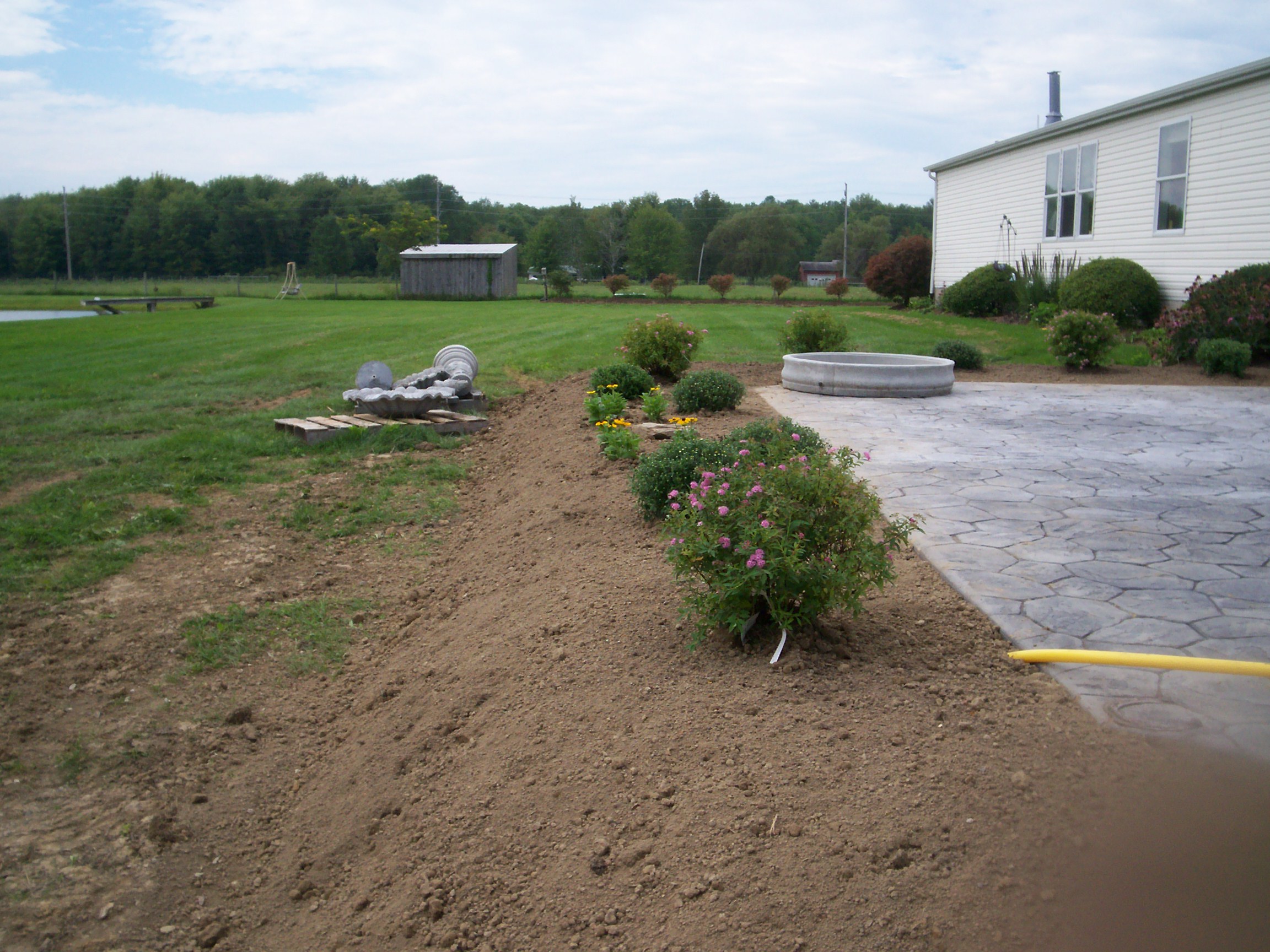 Today we were drowned in a two-inch morning rainstorm, but yesterday we were able to build and plant the new flower beds around the recently re-done patio. The plants look good. They even survived the morning deluge.