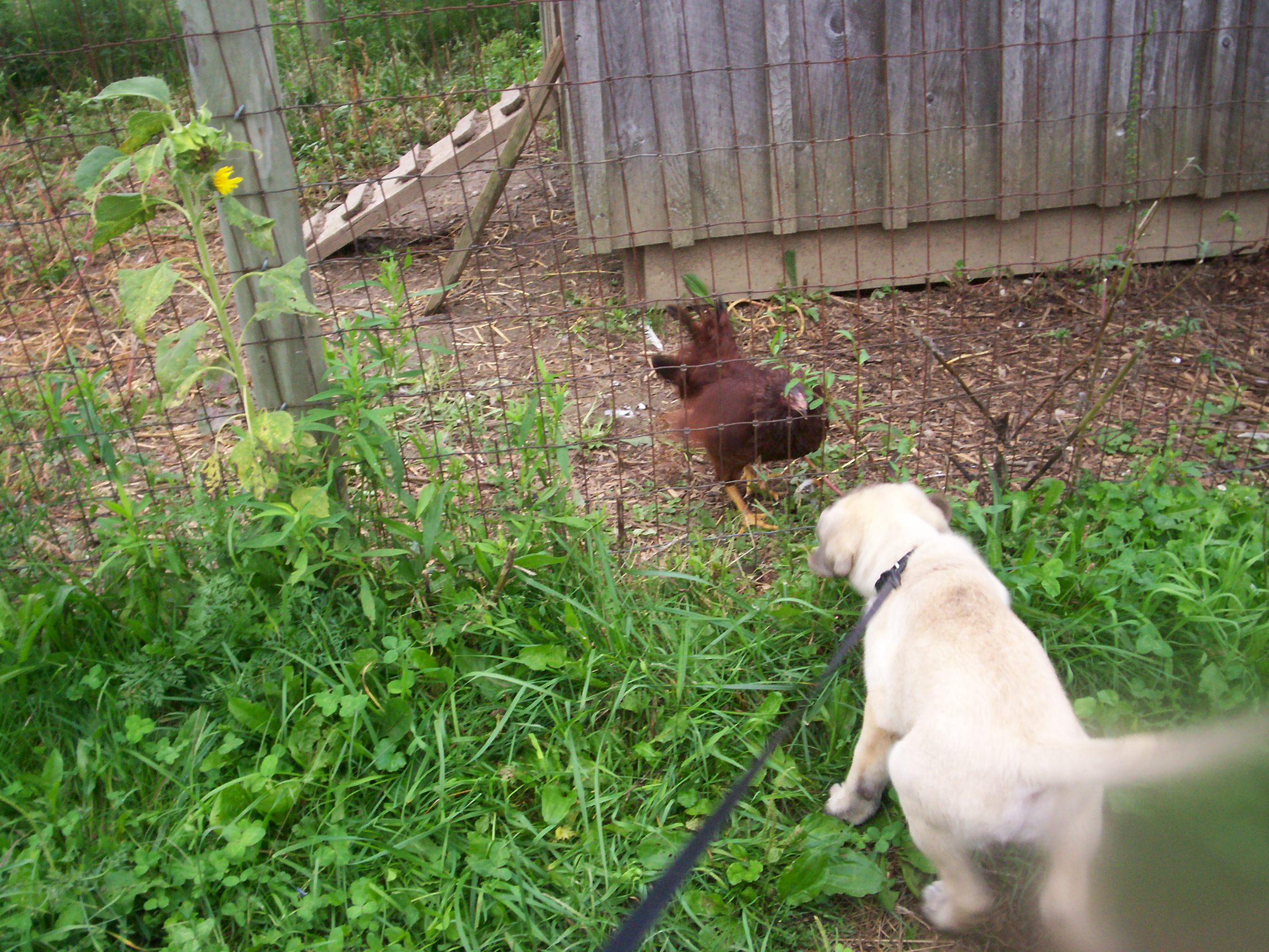 In our recently purchased flock of laying hens, came this lone Buckeye pullet. She is a feisty one. She rules the roost, so to speak 😮 She was the first chicken that King is getting to know. He thinks he might like chickens. She, however, is sure that she hates dogs!