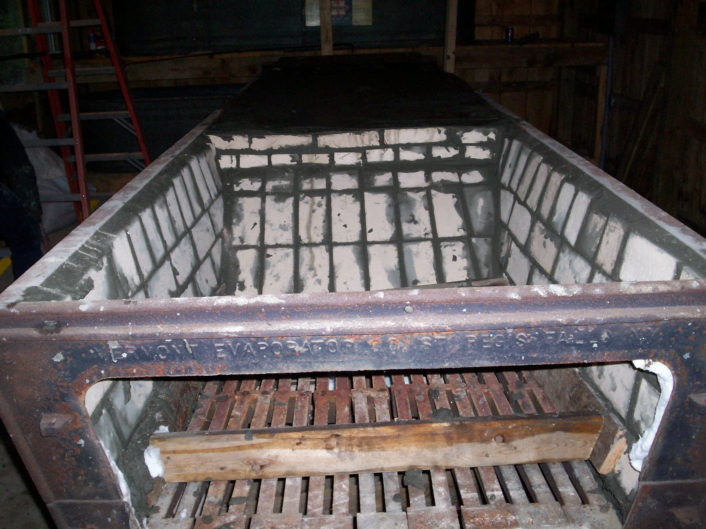The syrup arch is the firebox that the syrup pans set on. The fire is built, in the big area in the foreground. The heat travels the length of the arch and then out the smoke stack. The long syrup pans boil steadily as the sweet sap is reduced to maple syrup.