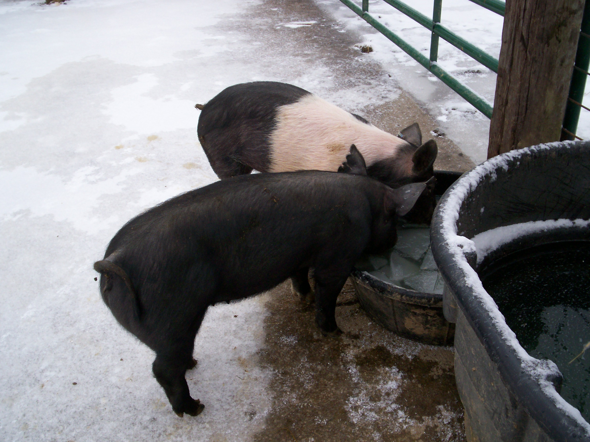 There are several ways to water pigs in winter. I chose the lowest cost most effective method that I could. If a container is left in the pen with the pigs, they tip it over, as soon as, they are done drinking. In no time at all, their pen is a wet, stinky place. Nipple type waterers freeze in the winter, unless some expensive options are employed.