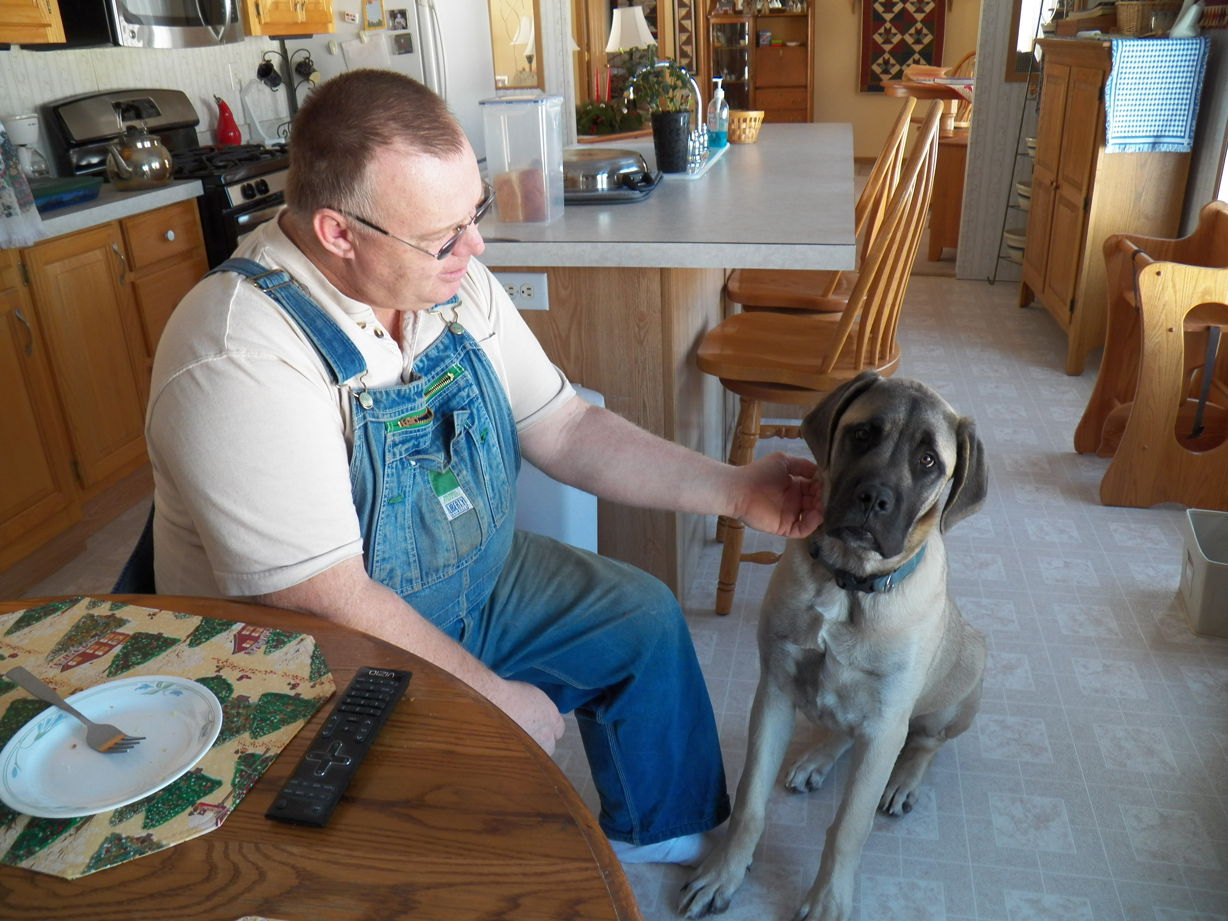 It is hard to believe that he is still a puppy. He is a bit clumsy, but very alert. He generally loves people, but waits for us to tell him that it’s “OK”. His feet are big, but I guess they have to be to support his massive frame. He tips the scale at over one hundred pounds now.