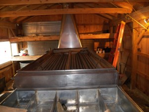 The whole system works on gravity. As the sugar content increases, the sweet liquid gets heavier. The heavy sweet stuff pushes towards the front part of the pan on either the left or right side depending upon where you are taking the syrup off that day.