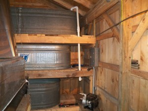 The middle tank on the shelves behind the maple syrup arch is an extra and will be used when needed. It gets filled with the pump by just swinging a couple of valves. When the sap is needed, I just open a valve on the bottom of the tank and the sap drains into the bottom tank once again…with gravity’s help.