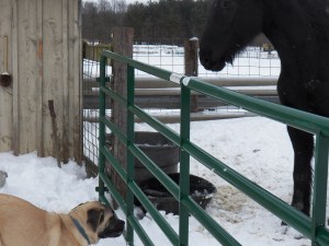 My crazy pup was playing with the draft horse Duke. The two of them enjoyed a bit of touch and run, in the cold and snow yesterday. There is no fear from either party…just pure fun.