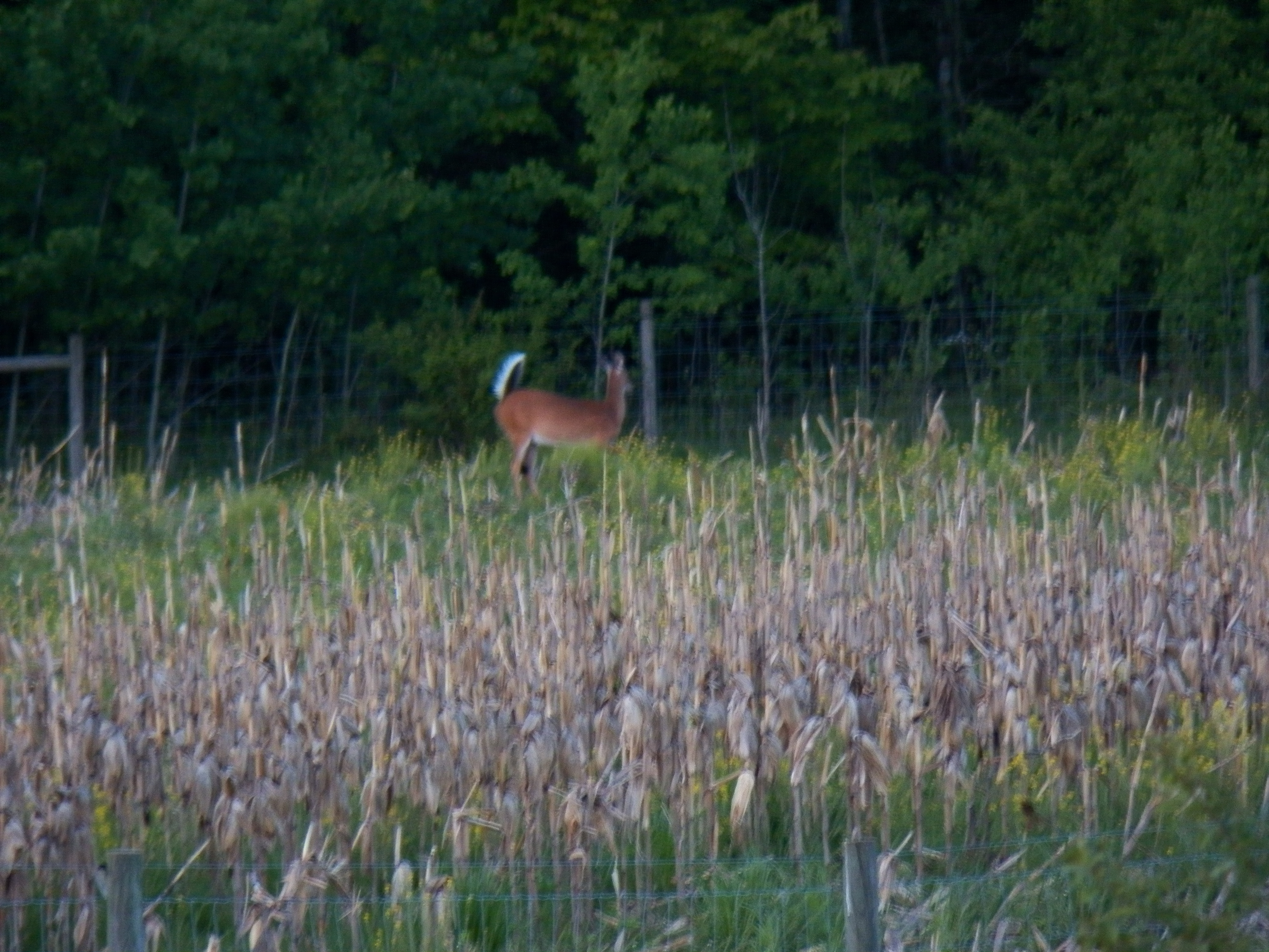 I snapped this picture tonight after chores. The deer, gender unknown, was startled out of the corn field. King’s booming voice echoed behind it, even though he was standing by my side. The deer never looked back.