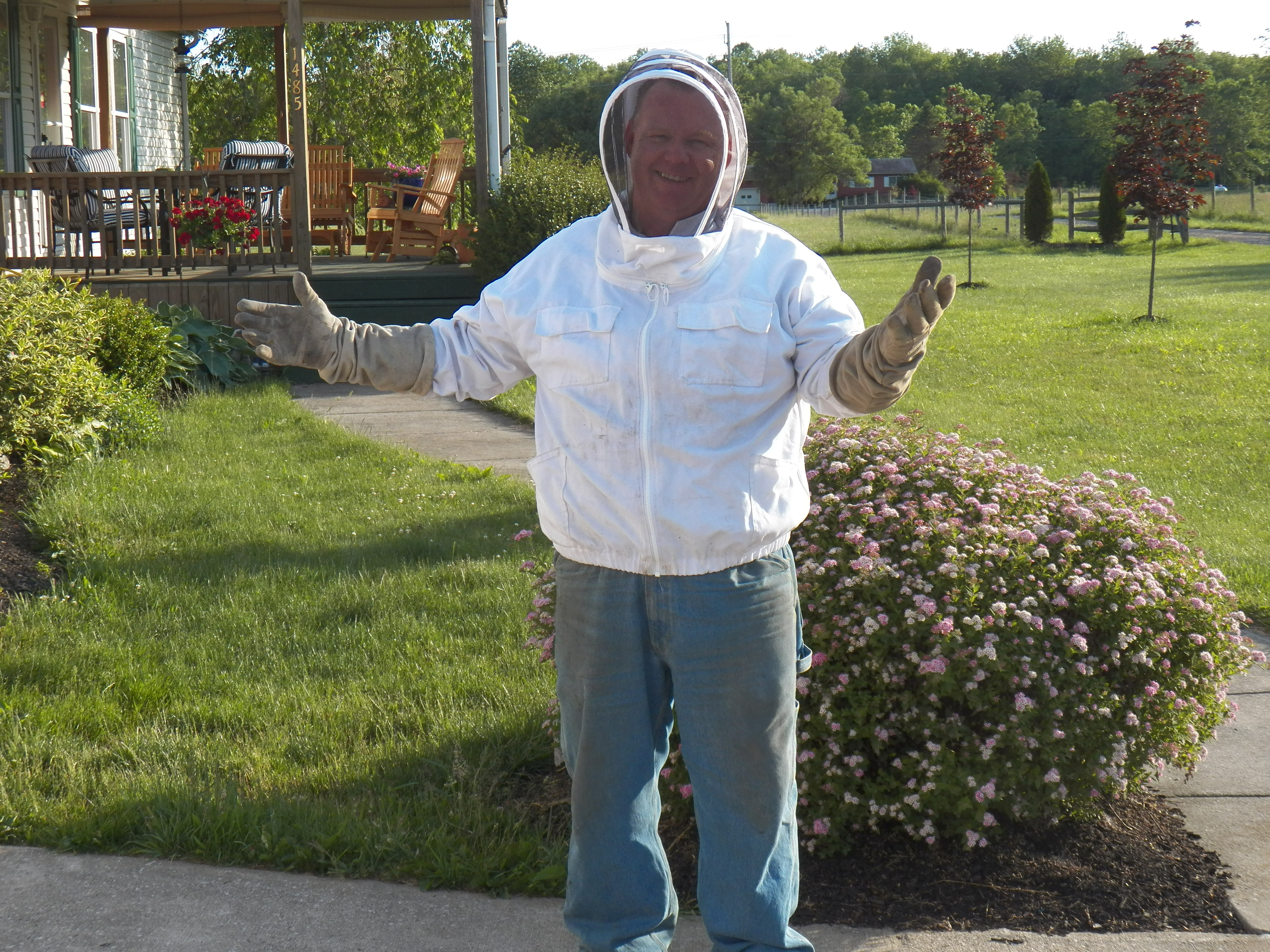 My daughter-in-law thought my bee suit was pretty neat. She snapped this picture, then watched from far away as I put the bees into the hive. They were grateful. I received not one sting, from getting them out of the apple tree, to putting them into their new home.