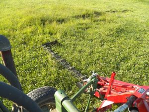 This shot is a view from the driver’s seat. The horses are walking along the standing hay and I am watching the sickle bar. I am perched up upon the seat, driving the horses, keeping everything in line and watching for any danger in the cutterbar’s way. There is plenty to watch while holding a hand full of driving lines… I can’t even text anyone 😮