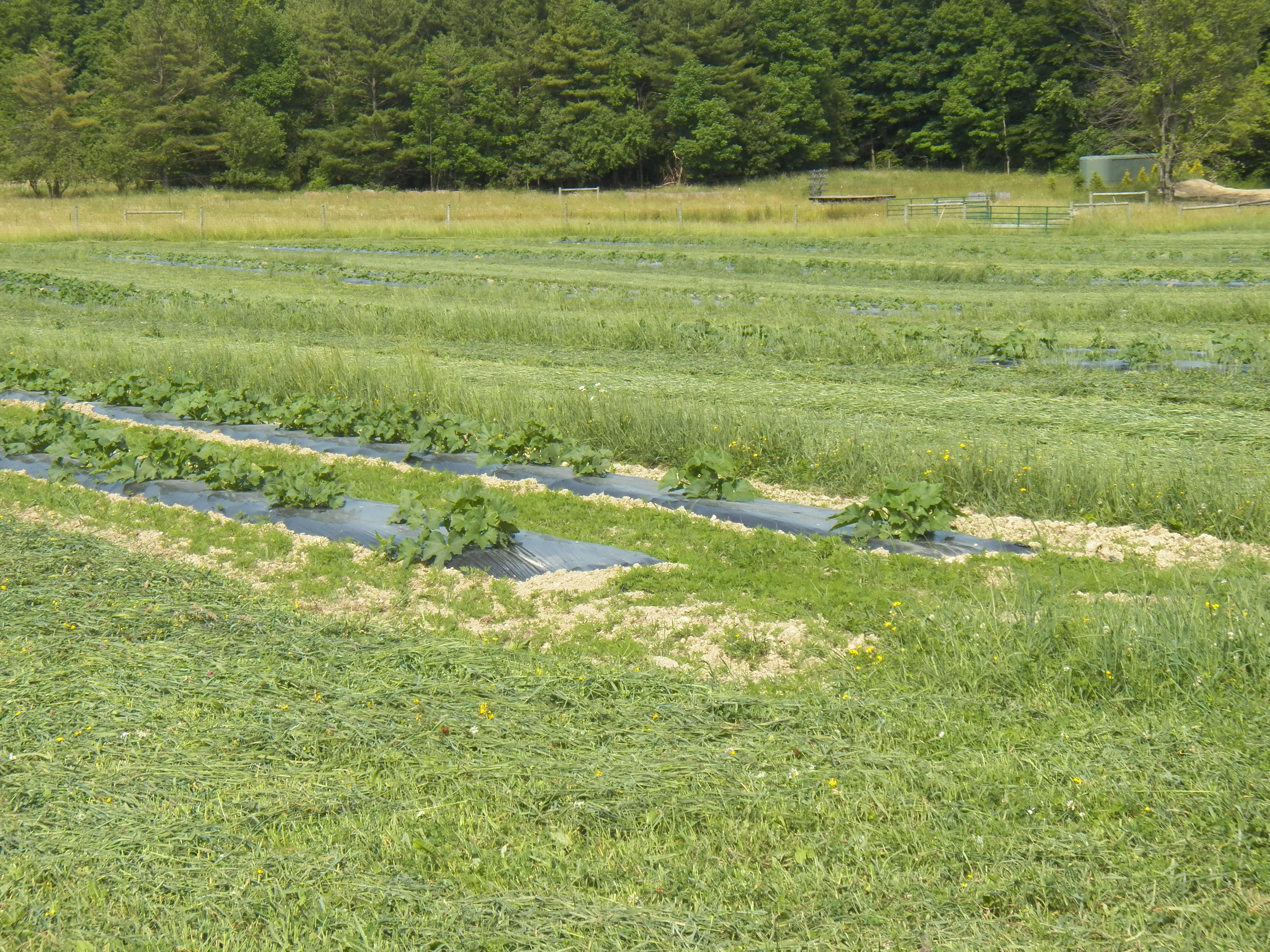 I am amazed by the pumpkin field. It was grazed short by the sheep until May 15th. I plowed it then, making the pumpkin strips. The hay I cut today is about 60 days old. It looks like a picture, now if I can just get it baled and into the barn before rain … I will be one happy farmer!