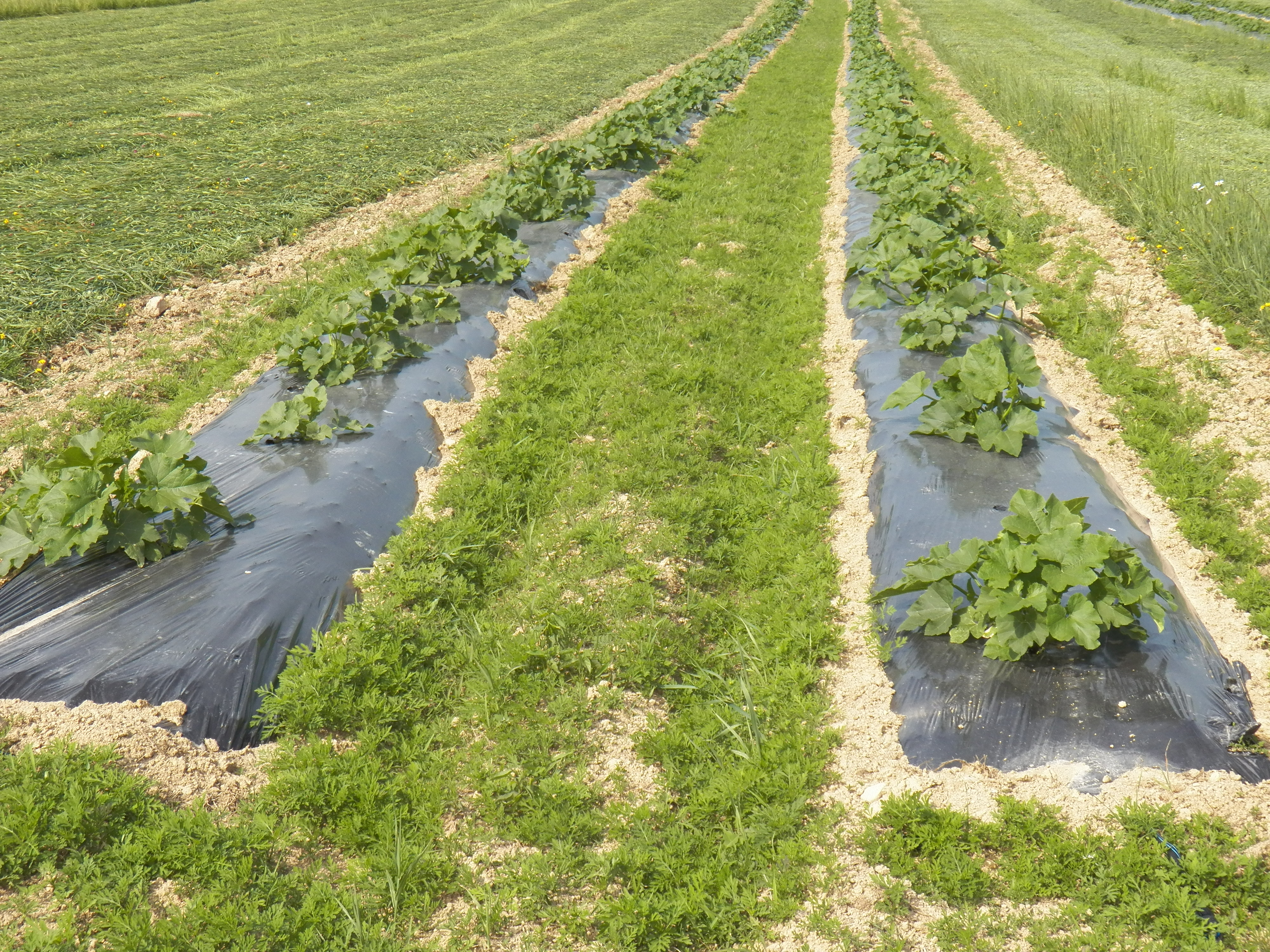 The hay is now cut in the field around the pumpkins. They will soon be sending out their runners. This is the part of the plant where the pumpkins grow. I want to get the hay made and then apply composted manure to the green strips. I am thinking that when the runners grow out into that space, they will get nutrients from the manure too.