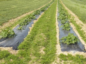 The pumpkins seem to be doing well. The plastic is keeping the weeds away from the pumpkins. I do need to get the weeds cultivated in between the rows. Right now they are small, but soon will be menacing water stealers, that have to go!