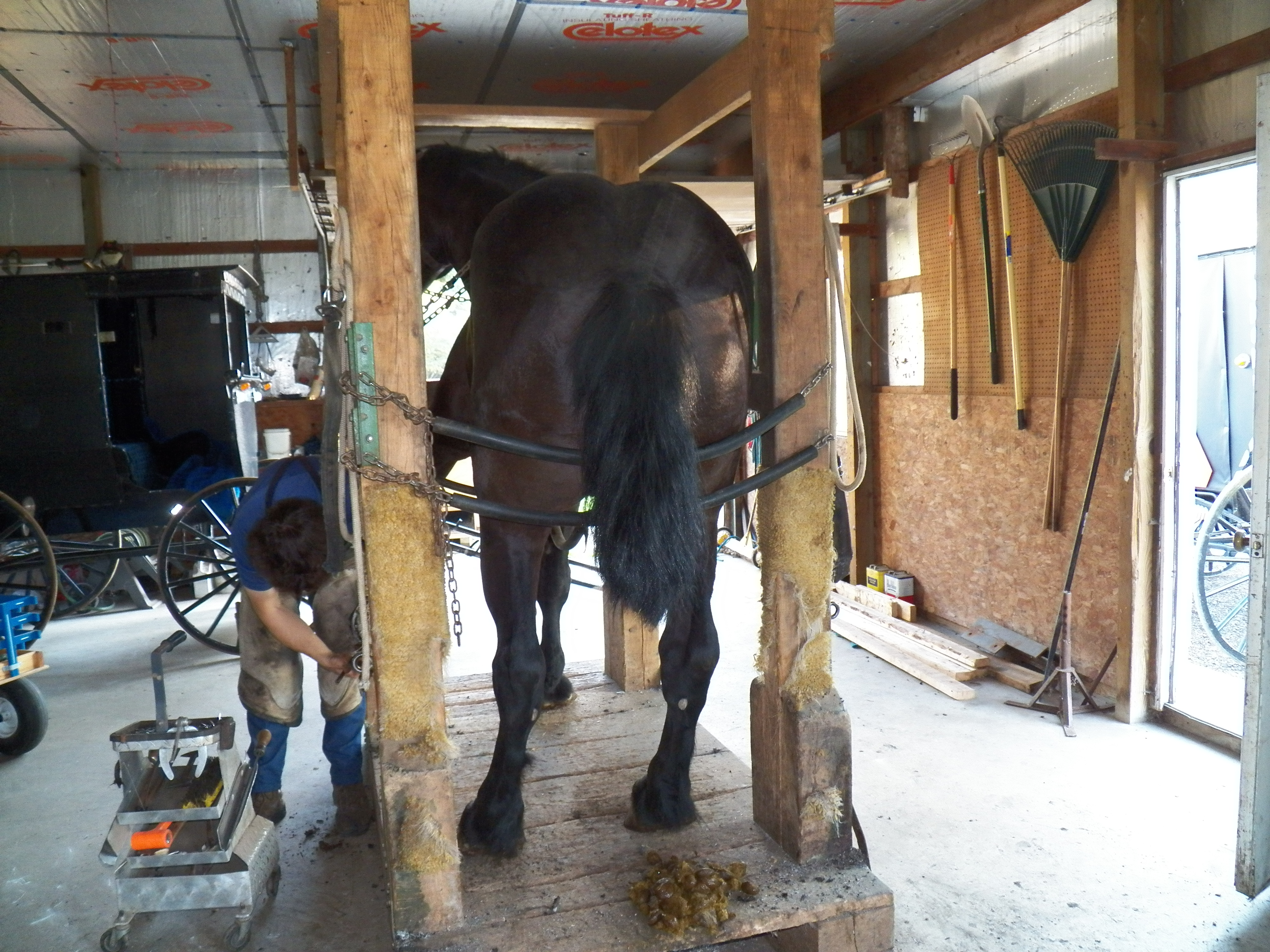 My farrier uses stocks for the draft horses. I am glad that he does. The horses are secure and safe, as is the man working on their feet. Some folks don’t think stocks are a good idea, but I am a fan of them. Well made stocks are comfortable and safe, giving the farrier’s back a break.