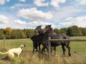 The other day, King was walking with my wife. He and she were checking out the horses. The big boys started to come too close to the fence for King’s liking. I think he barked asking the horses to play. The horses thought he said, ” Get away from my mistress before I eat you alive!” King was bewildered when the horses took off for the furthest part of their pasture for a while.
