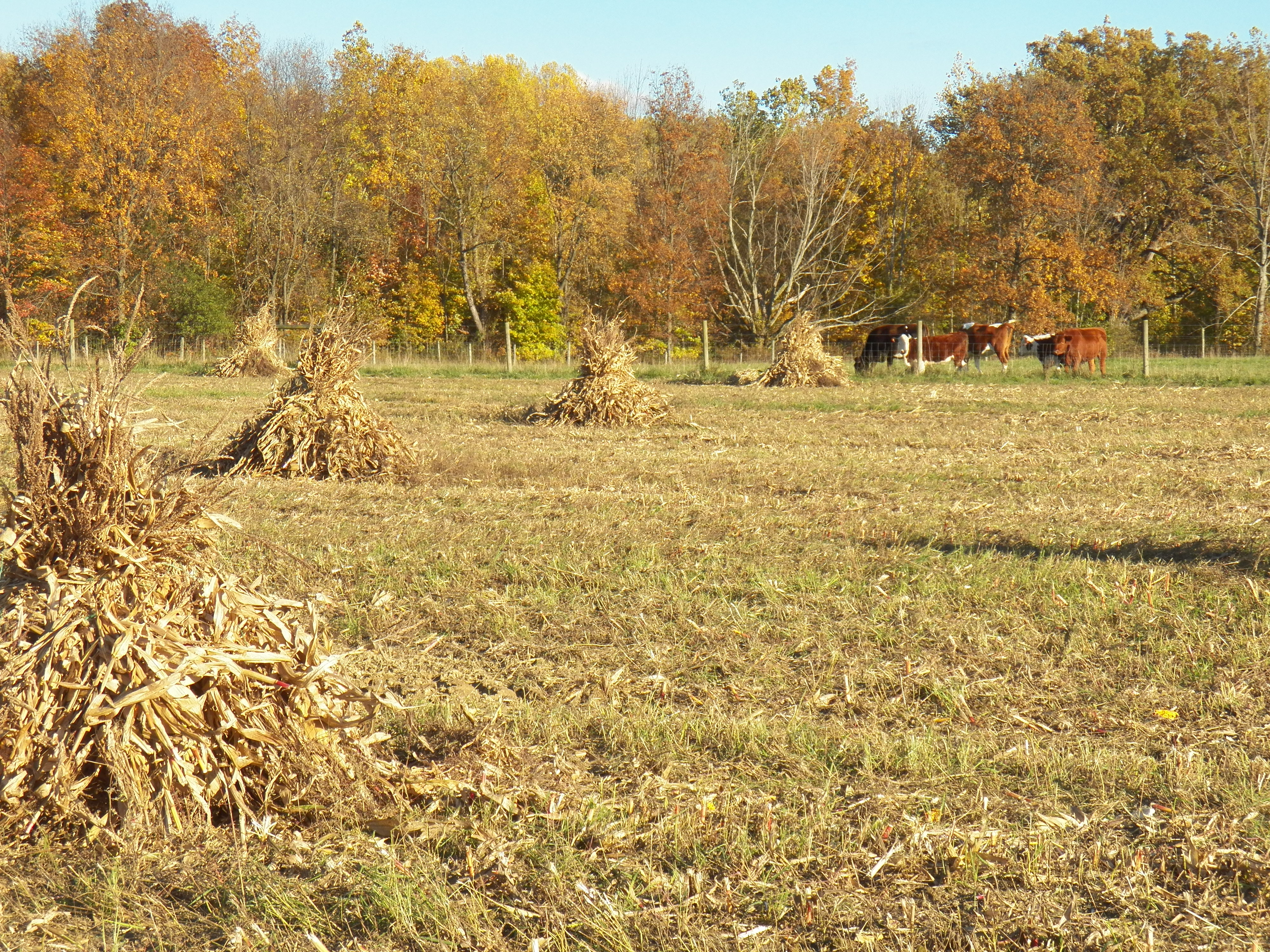 My corn shocks add a little something to look at too. It seems even the cows are wondering what they are. I Like to see them in the field, but like to see them all hauled in and harvested too. As soon as the rains settle down, the final push to get the corn in will take place. It is safe for now, drying in the shock.
