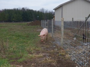 Our sows are in a pasture that contains 2.5 acres of land. They spent half of the first day walking the fenceline to see if there was an opening other than the usual gate. So far, they have not created an opening of their own. I think they are now very content in their little grassy hamlet.