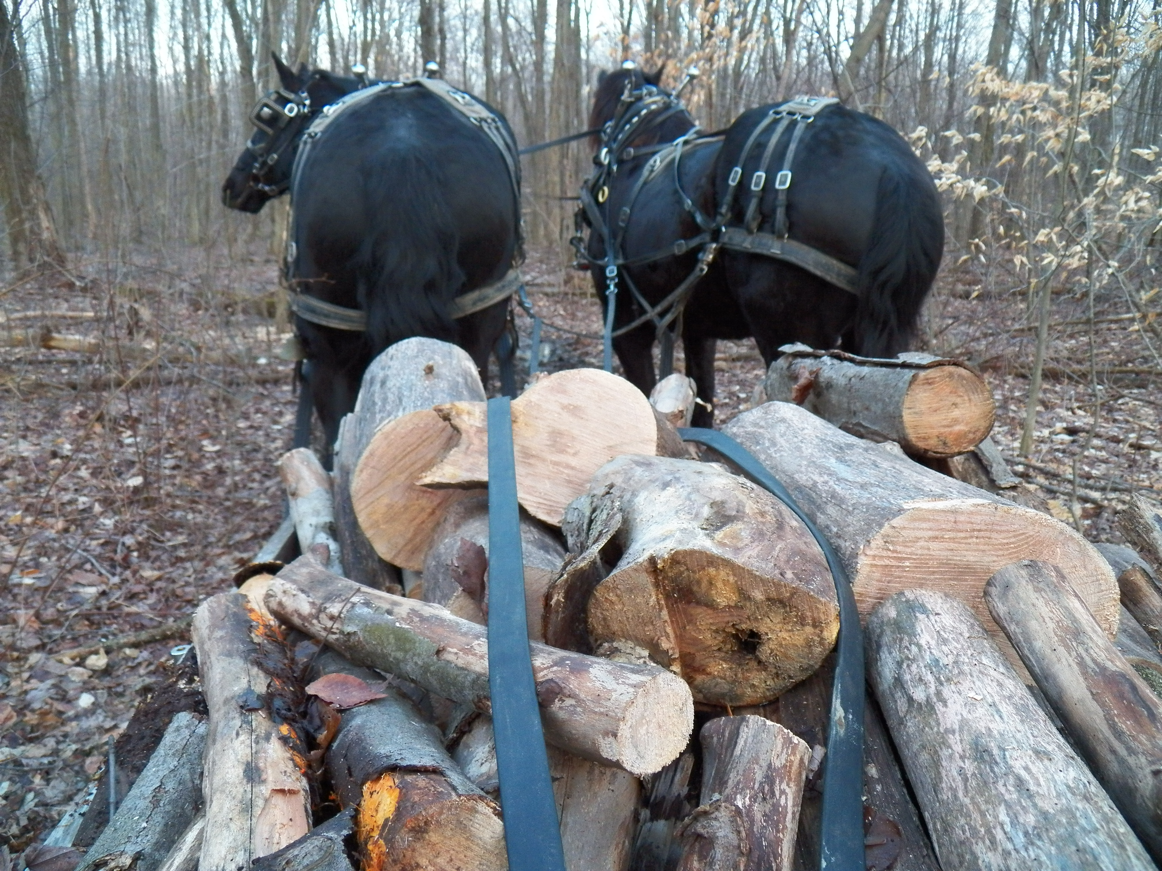 The horses handled the big load easily, even though there was no snow. They wanted to trot with the sled, but I held them back. The slower trip is safer and easier for an old lame man to hold on! I talked to the horses a little too. They are far from broke the way that I want them to be, but we get closer every day. They know their names now as Knight and Hoss …. for a while they thought their names were “whoa and Dammit”