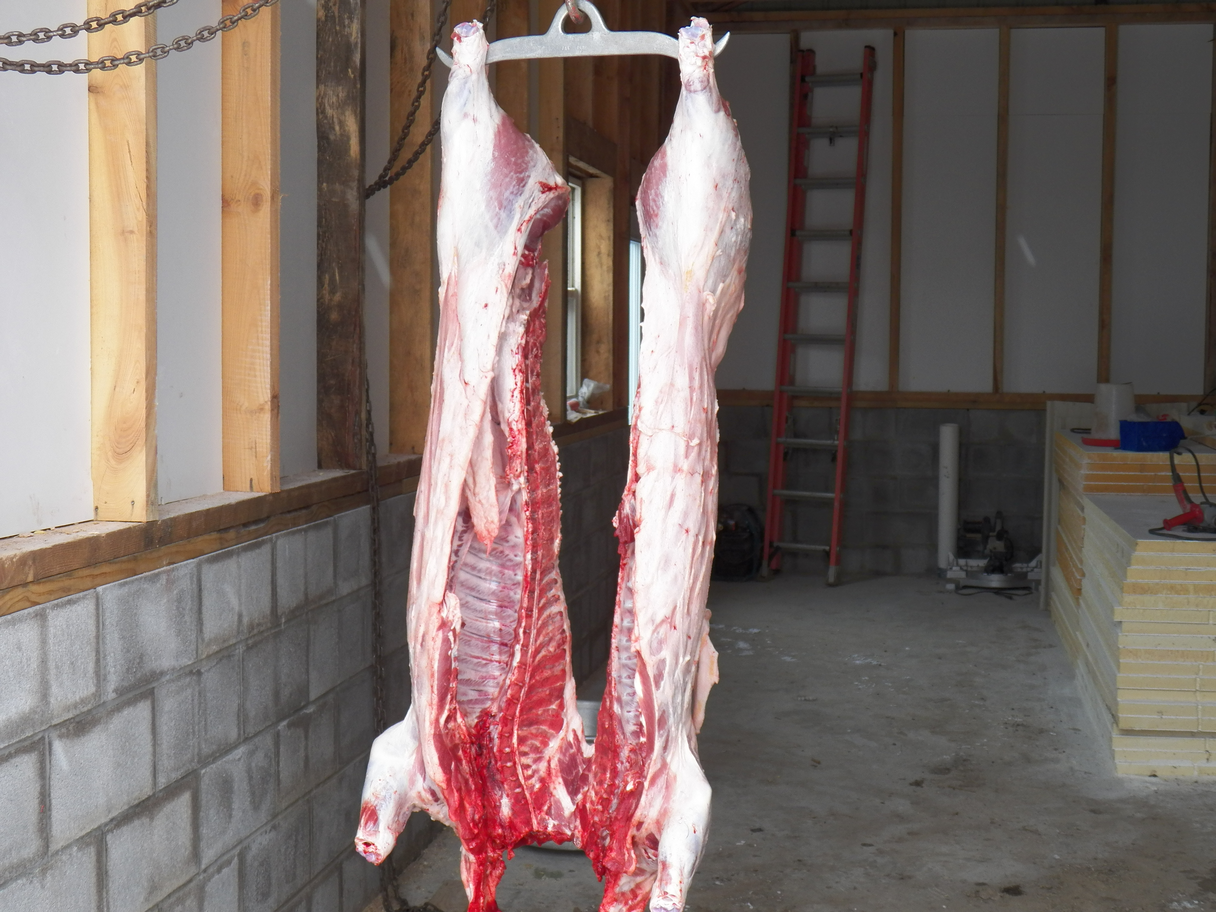This morning we butchered the pigs. They were dispatched quickly, quietly and humanely. We killed them out on the snow. They were bled out there. We then skinned and finished the job in the shelter of the new slaughterhouse. It is far from finished, but worked very well to keep us out of the wind and cold.