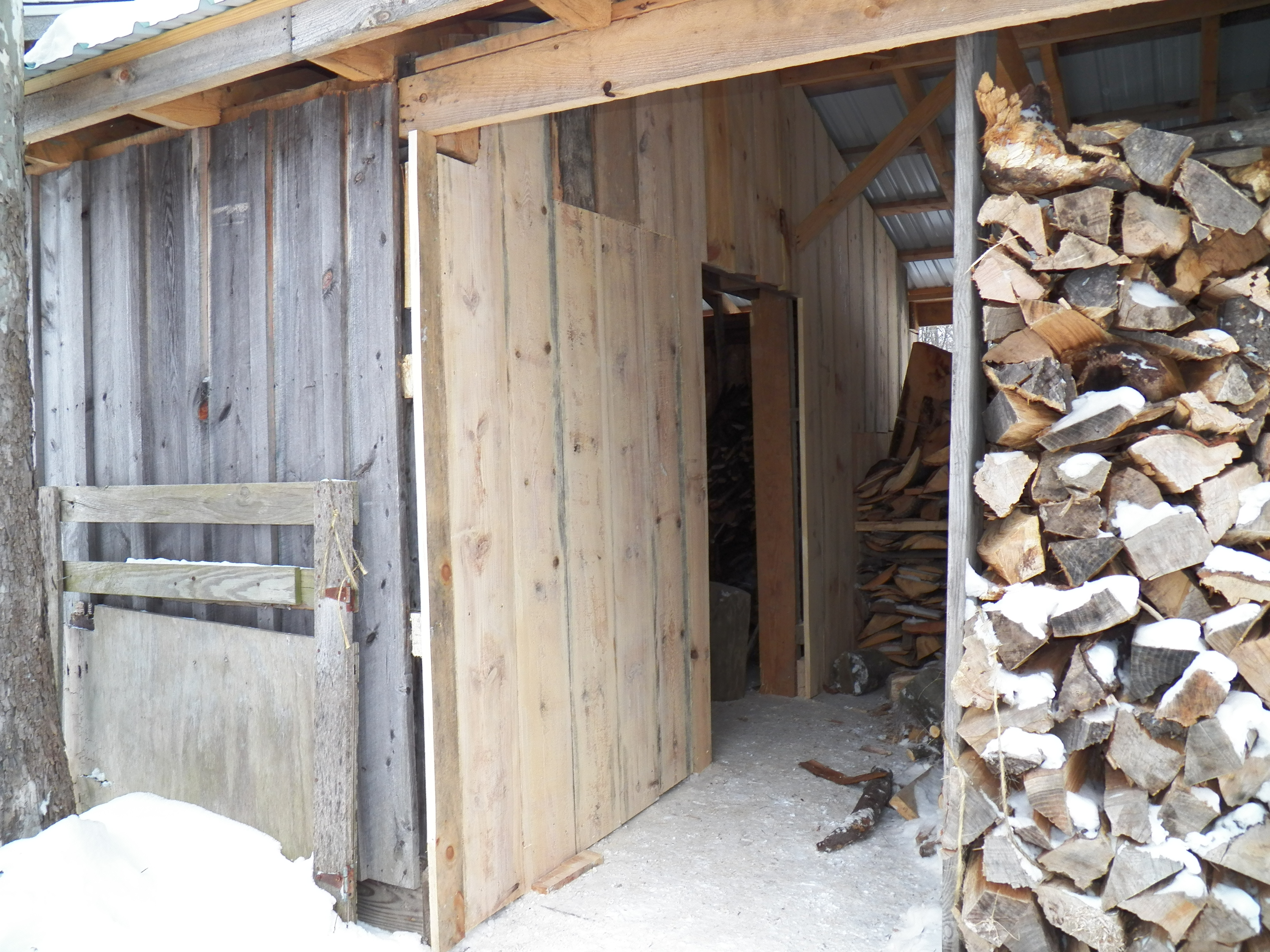 Today, I awoke to a small blizzard. Schools were closed, snow was flying and what was on the ground was about eight inches. I decided that today would be a good day for constructing a second wall on the sugarhouse. This created a room ajacent to the woodshed and a sort of inner scantum to the sugarhouse…okay, it’s like a big hallway that blocks the wind 😮