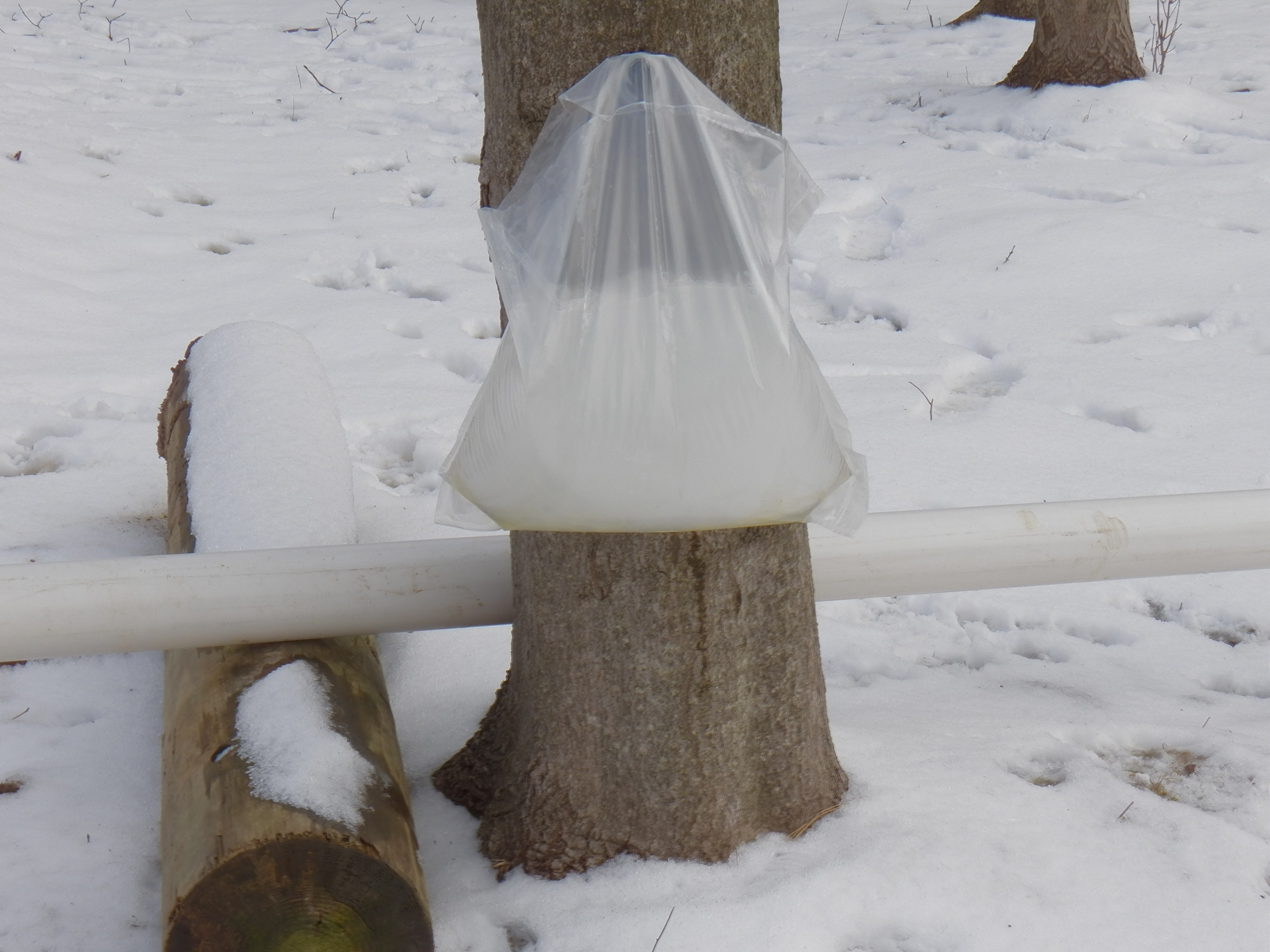 Our cold temperatures continue. The sun does shine every other day or so. It is nice to see the sun, but it is creating a problem for us. The south side of the maple trees get just warm enough to drip by late afternoon. The nights are cold, so the new sap freezes in the bag. This repeats almost daily and now our syrup season is on ice!