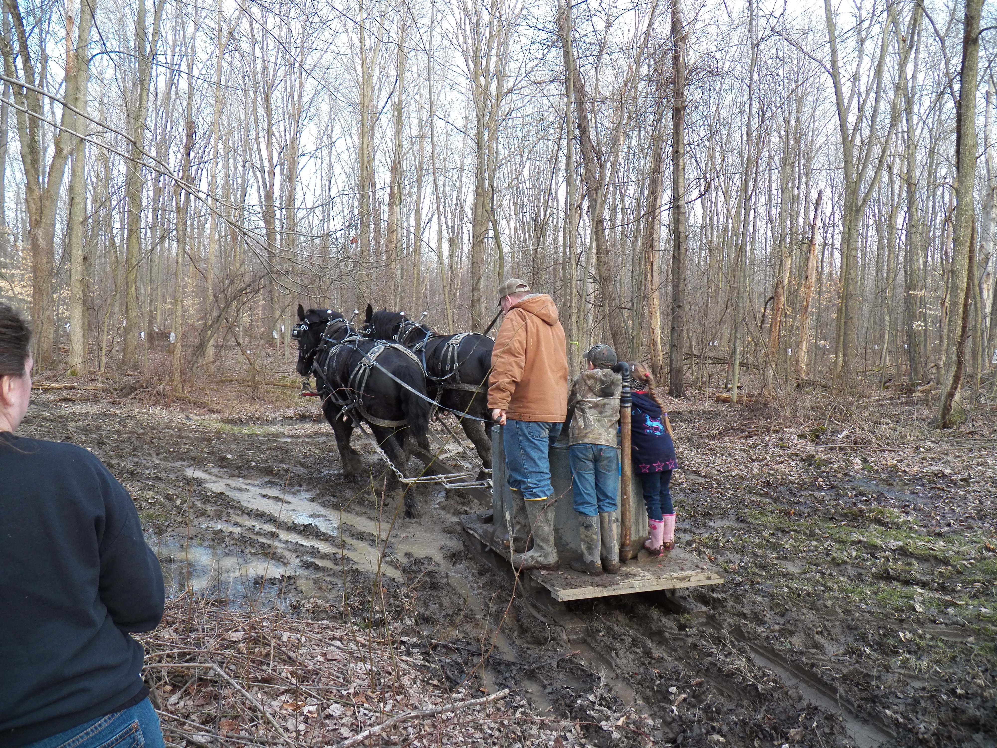 Winter has returned, the trees have stopped running and some ice is in the sap bags. It is a big change from Saturday a couple of weeks ago when this picture was taken! Knight and Hoss had to bear down a little to draw the sled through the woods that day. They didn’t mind, the work felt good to them.