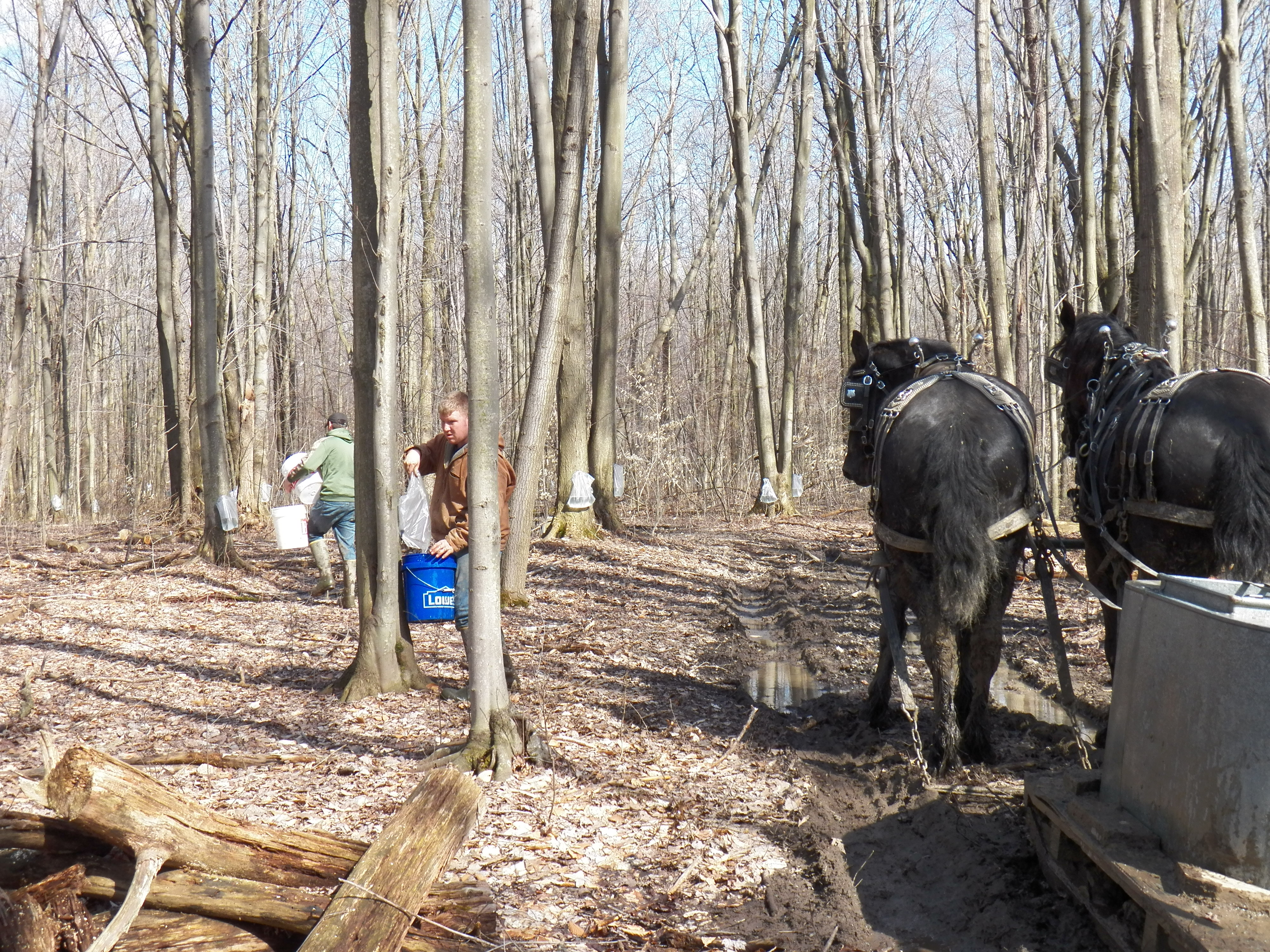 After several trips up and down the sap roads, stopping many, many times along the way, the horses have the routes memorized. Jake was gathering sap along the edge of the roads. He would ask the horses to go. They would lean into their work, step off together and walk until he told them, “Whoa.”