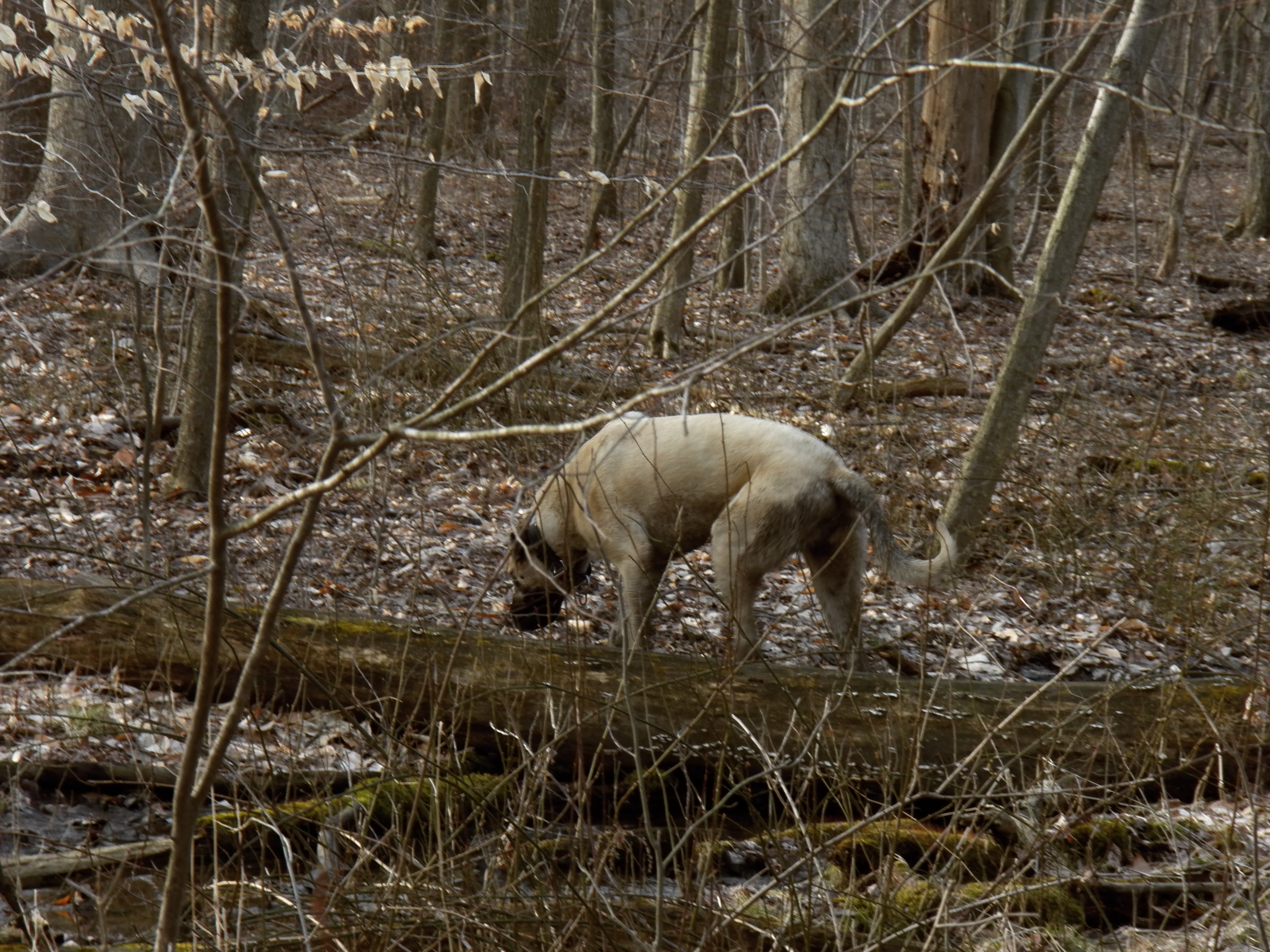 King walks with us everywhere. He is always watching for danger. Right now he has decided that nesting geese are encroaching on his territory. He runs them off, even trying to chase them as they fly. I am keeping him away from the birds along the river, but I am very happy to let him chase the flying poop machines away from our pond.