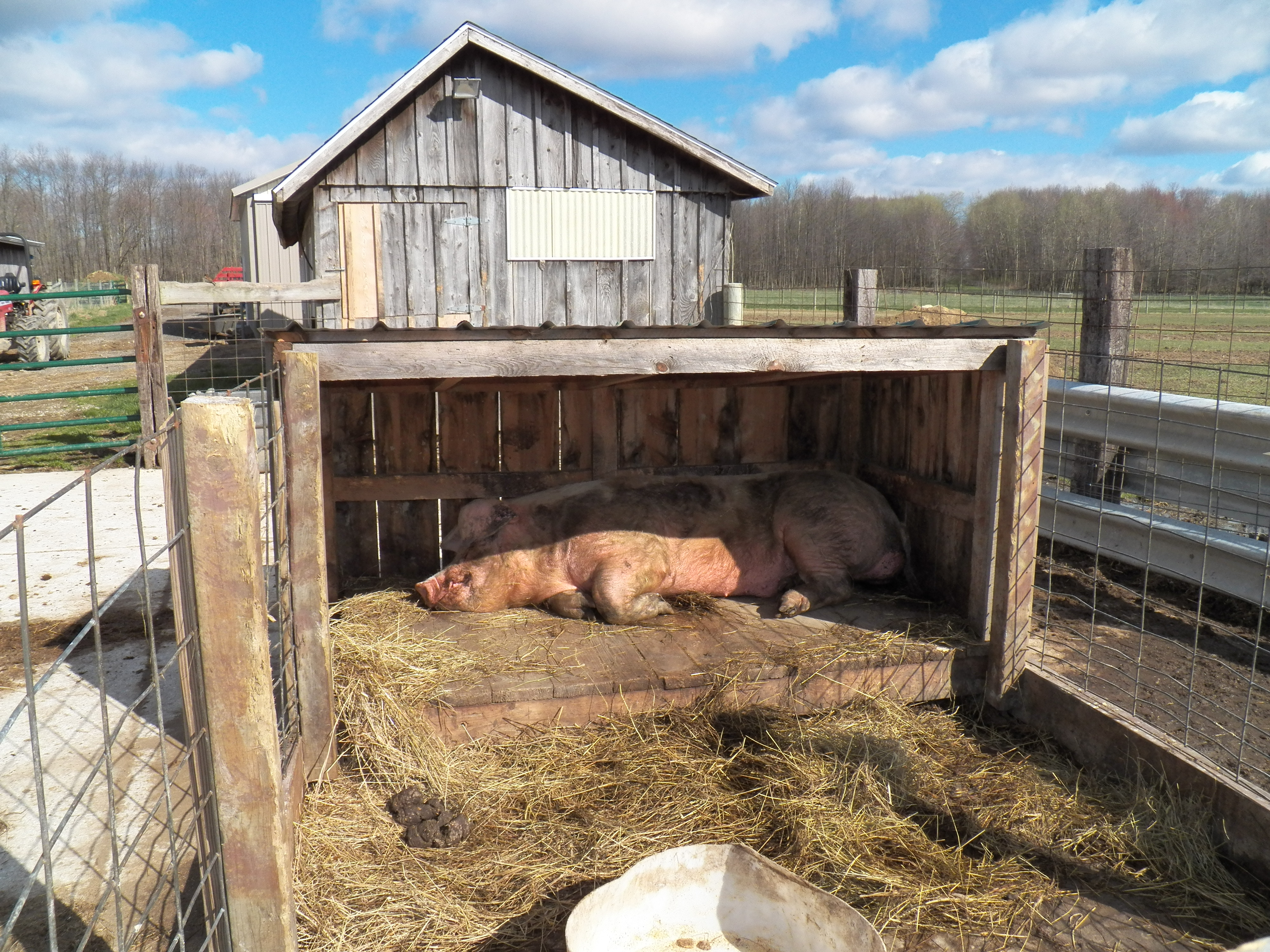 Our boar Noah is living in the root-a-tiller for now. We placed it on the feedlot cement, so that he does not dig to China in the soft spring ground. He is living the bachelor life, because his ladies are nursing babies, or in one case, is about to be. I don’t want him bothering the poor mothers, who already have enough to do.
