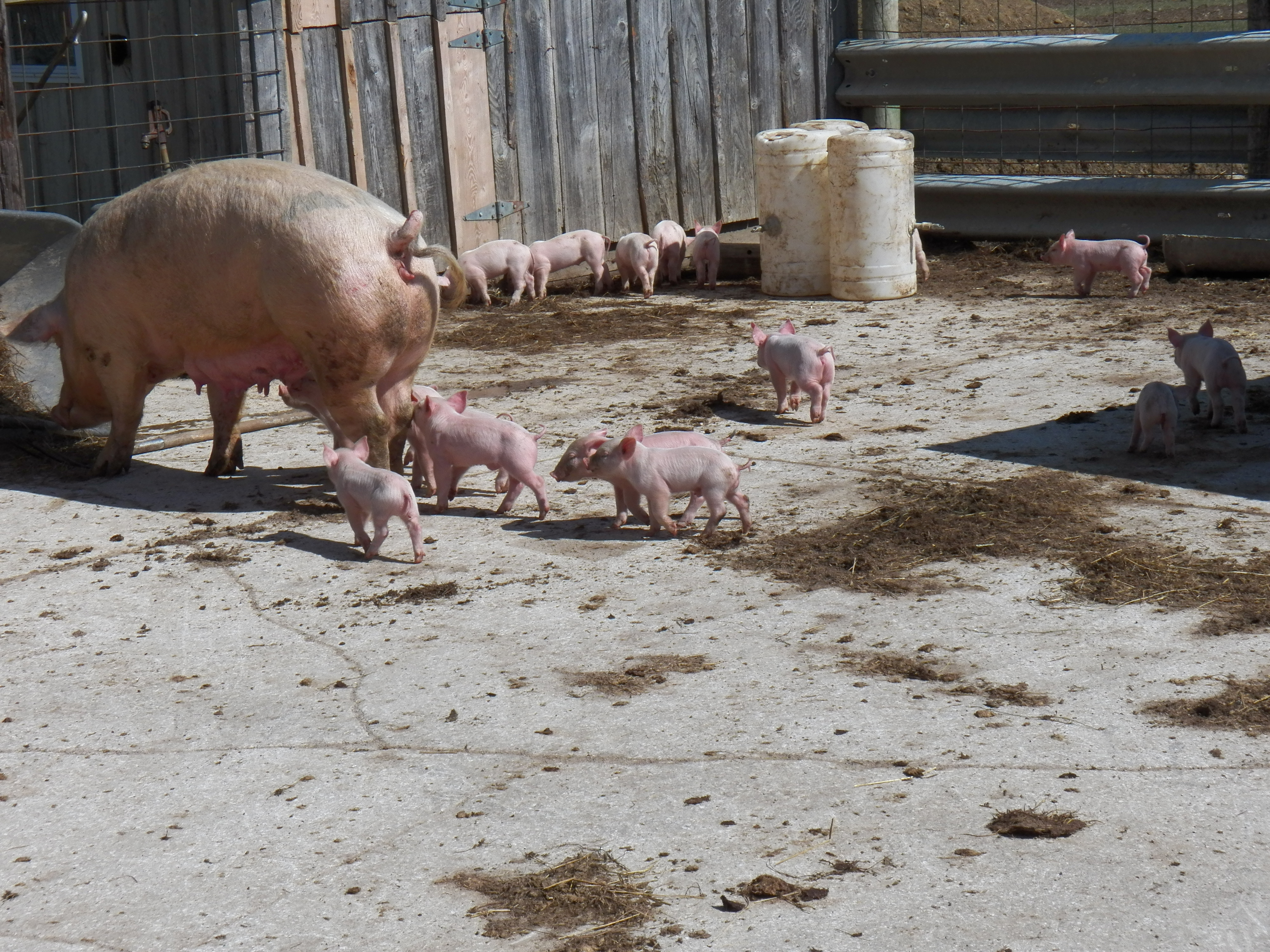 They are now eating pig feed on their own, eating grass and still nursing. They are growing very well. They explore a little further each day. They are no longer afraid of the cats … or the giant beasts with the iron feet…aka the draft horses 😮