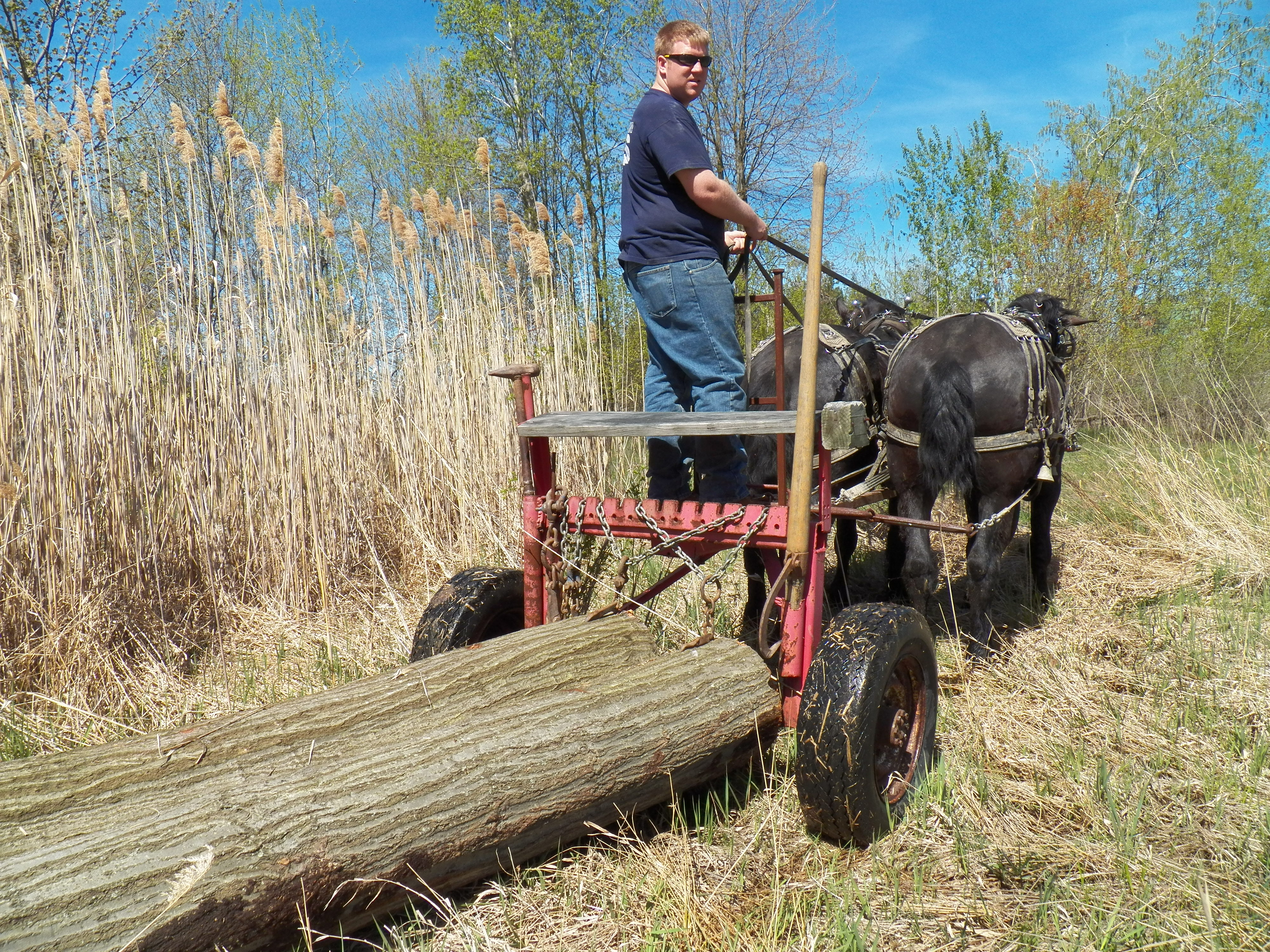 The horses have only worked in our own woodlot. Today was their first day in the logcart. They handled it like a pair of professionals. I am proud of both the team and the teamster. My son is not new to logging. It feels good to him too, to be driving strong horses hauling the heavy logs.