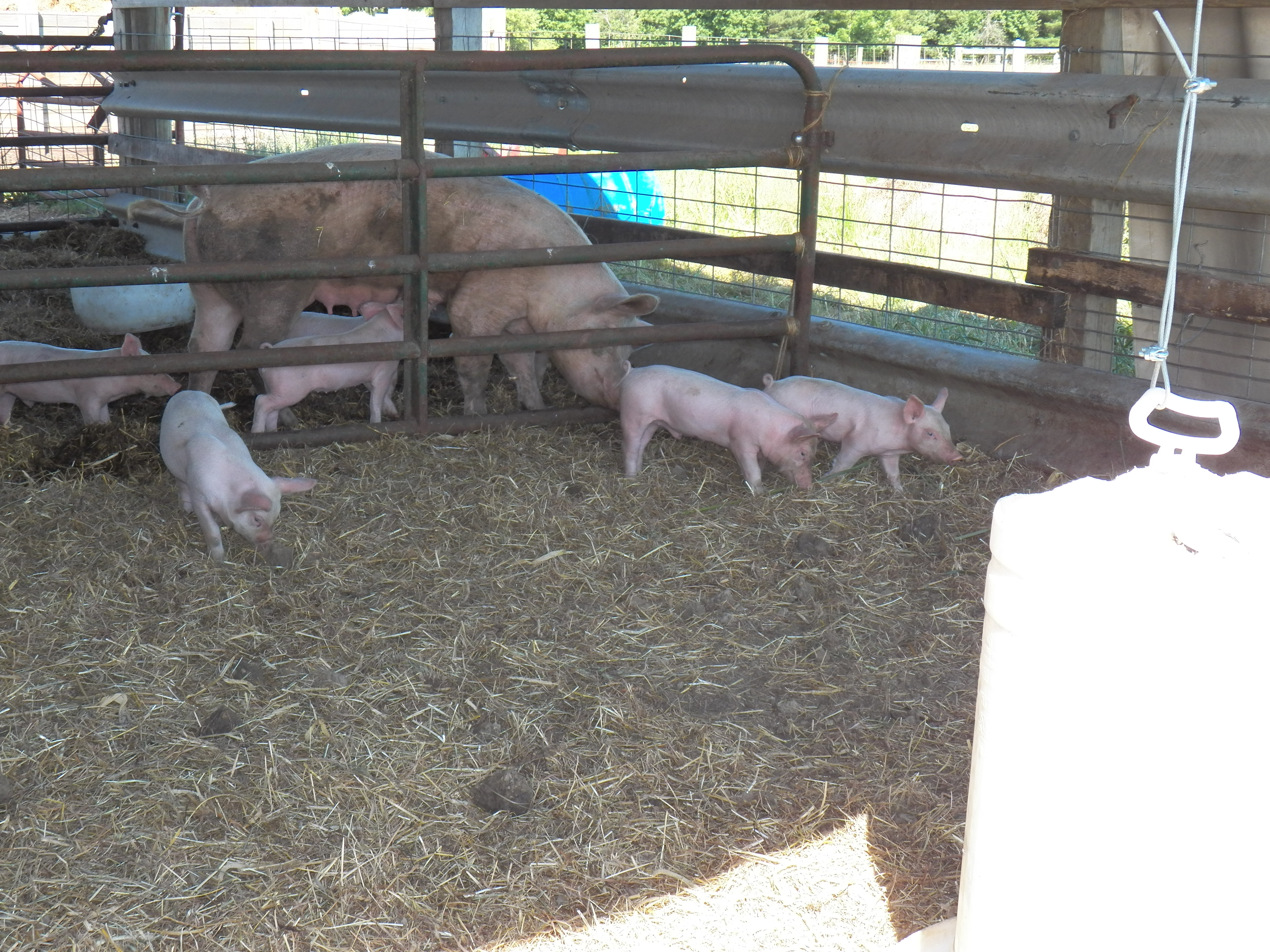 The little pigs are eating and drinking on their own. Mom is ready to be done nursing, so one litter of piglets will soon be weaned. They will venture out into life on their own. The first couple of days, they will be right next to mom, with just s fence panel seperating them. They can be independant, but still run to the fence for reassuring grunts and nose touches.