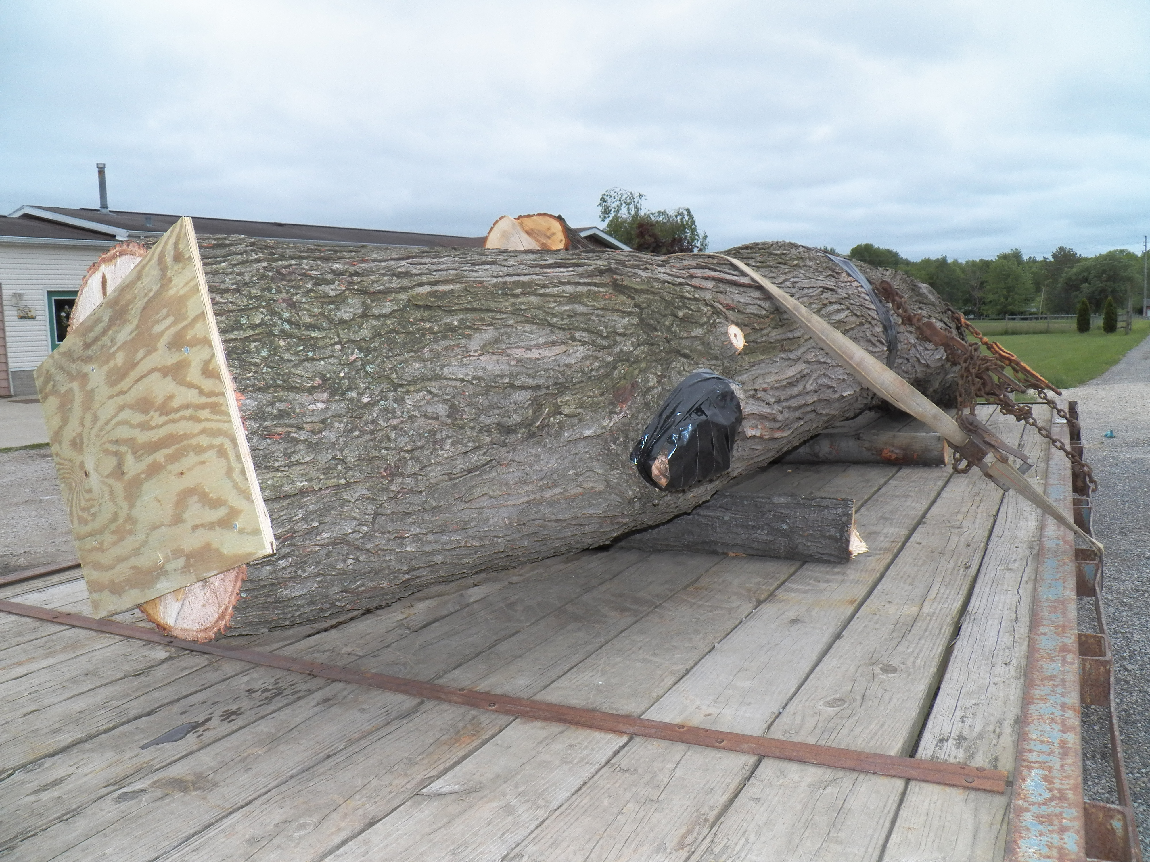 We decided to just take the whole tree section rather than fell the tree and smash the bee’s home. The top section of the standing tree was a piece fifteen feet long. We cut it off four feet above the top opening in the tree trunk. We cut right through a section of honeycomb.