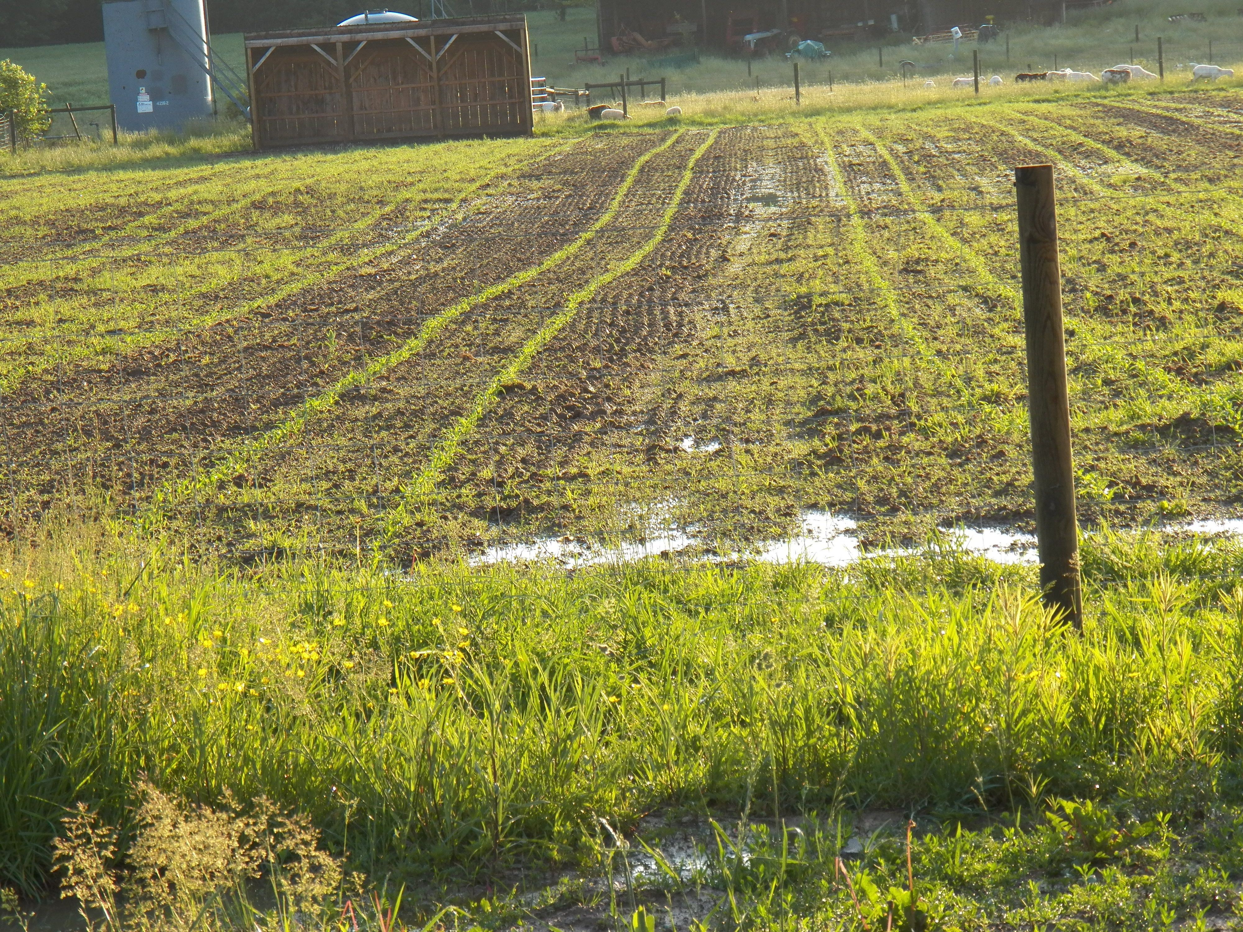 Boy oh boy, the rain is making it tough to keep up with my outside work. The photo shows corn up and growing among the weeds. The field was barren when we planted the corn. I expected to be able to cultivate by now, but the rains just keep coming. The weeds keep growing and the planting window is closing.