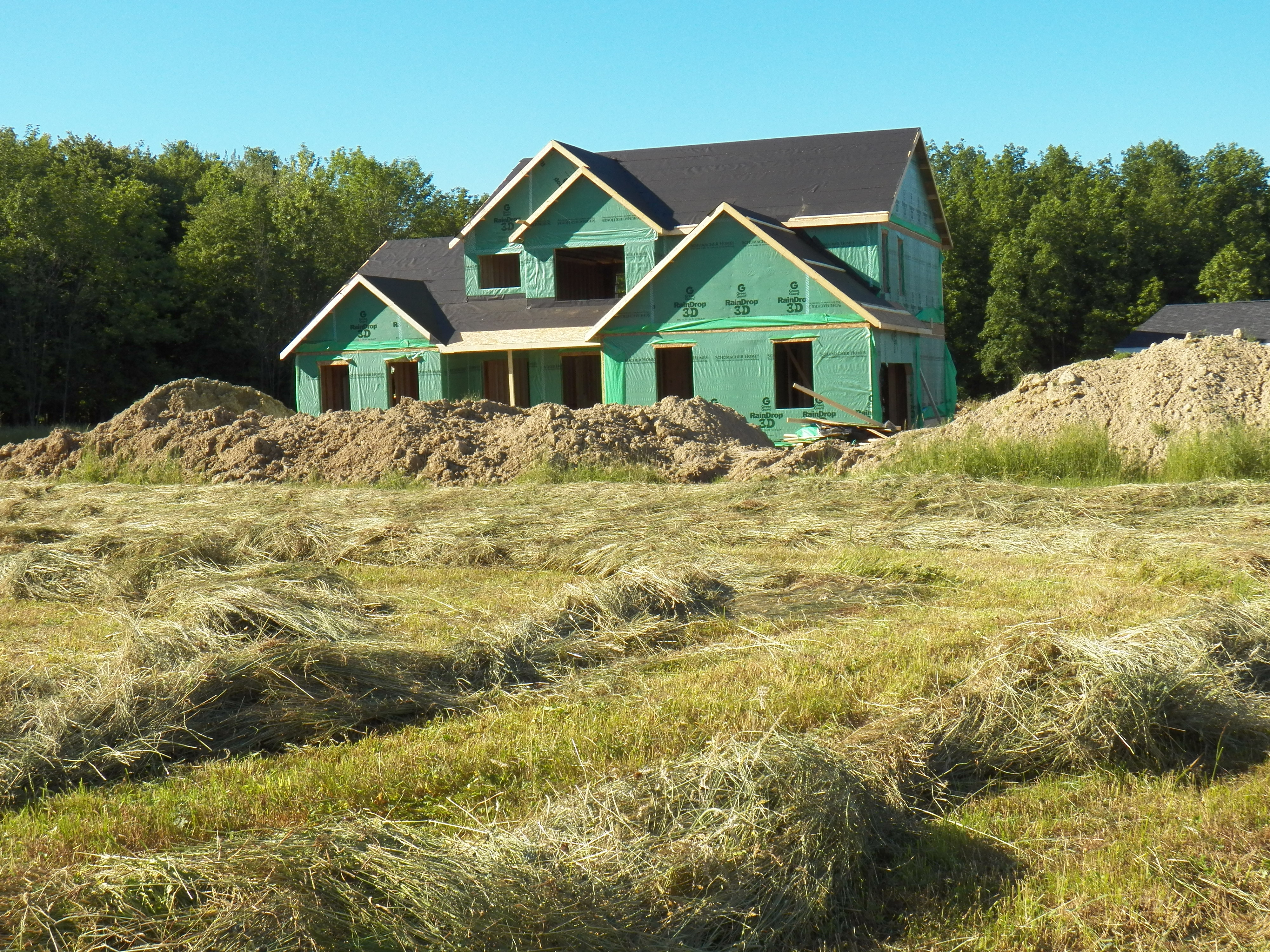 In my old meadow, a house is taking shape. It belongs to my son and his wife. I did make the hay that was growing in what will be their front and back yards. It was very odd shaped to cut, but the hay was heavy and well worth the effort.
