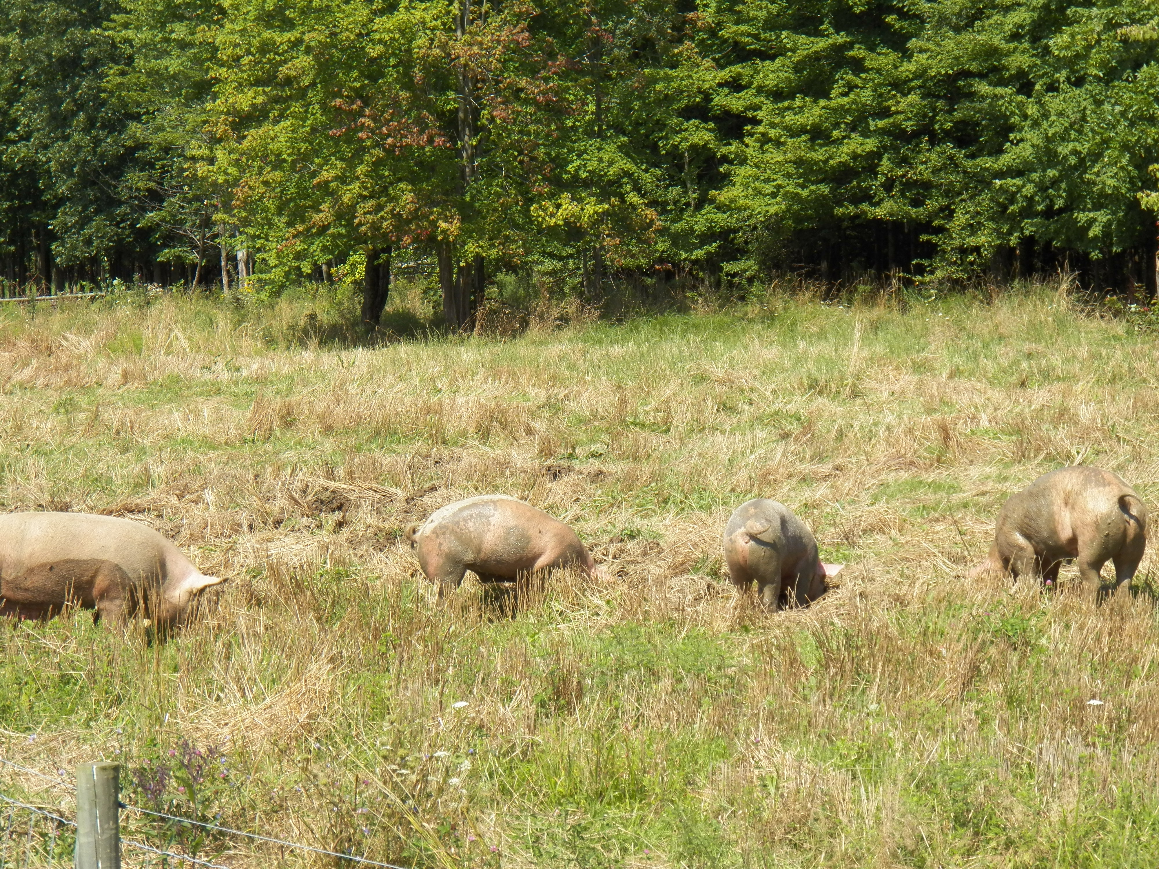 I just have my sows and the boar out on the field. It is amazing how much more content they stay. The field is of about four acres in size. It has woodland edges, a row of tangled crabapple trees, a few old regular apple trees and a small hidden meadow, along with my 2.5 acres of harvested speltz. They make use of every bit of the space.