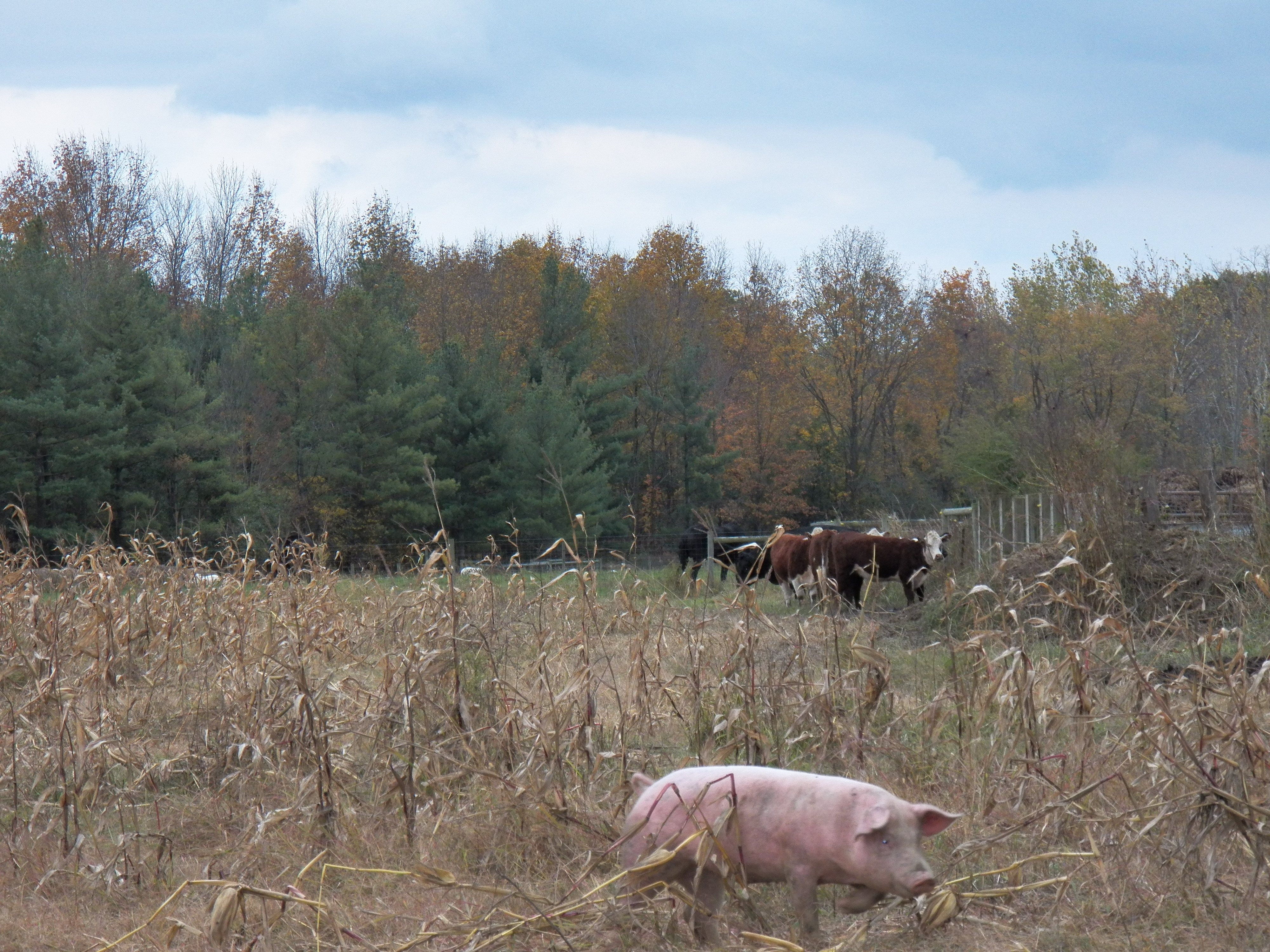 The cows and pigs are making short work of cleaning up the little corn field. They weren’t too sure about each other at first, but now pay very little attention to one another. Yesterday, they were all napping in the same shed, sharing the warm sun, after a big meal.