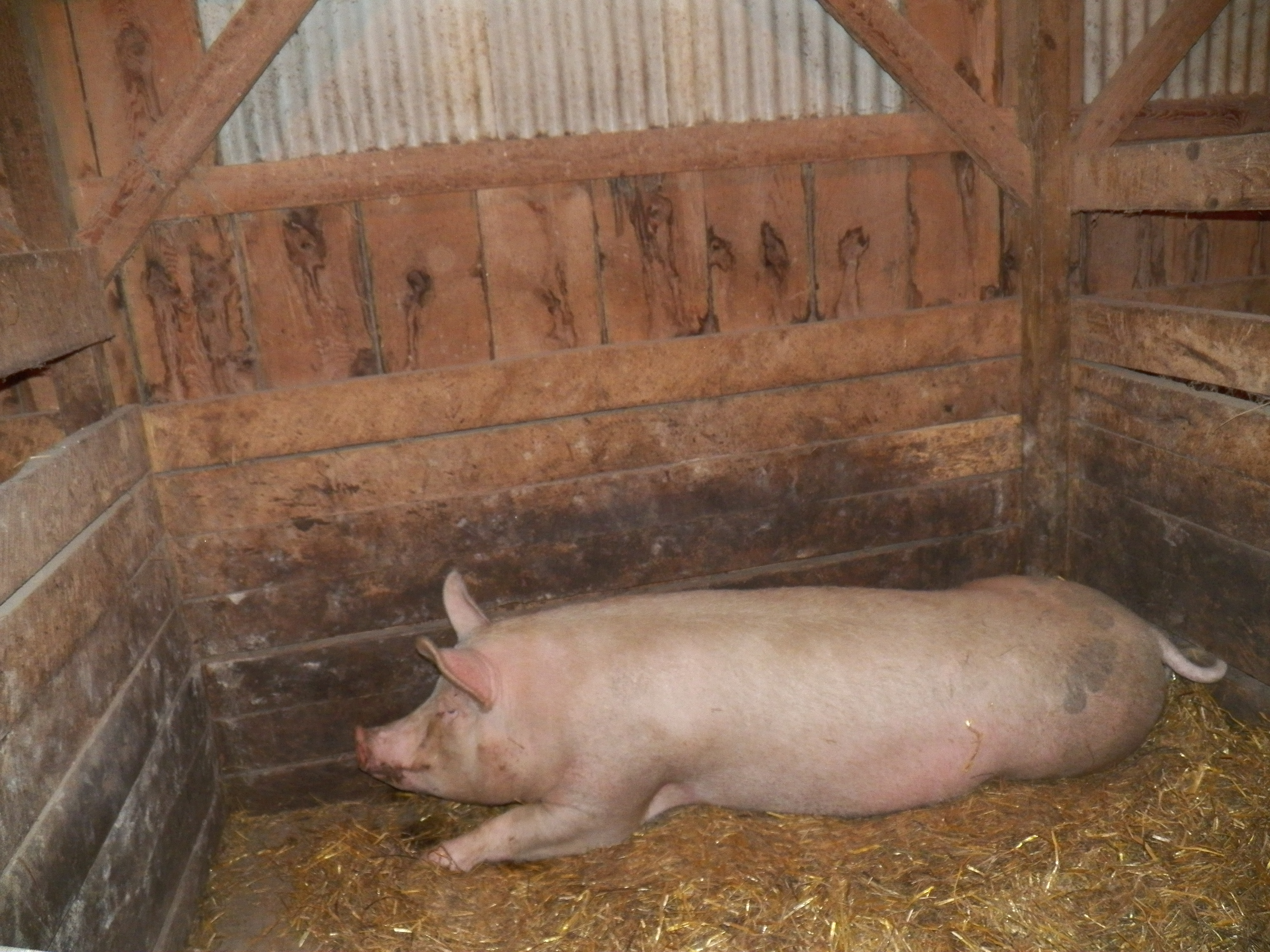 The sow in the photo is in an eight foot by eight foot pen. She is a big girl, but still has plenty of room. She also gets “playtime” twice a day. She gets to exercise and walk around. She soon gets tired of the whole exercise thing and walks back to her pen. Or perhaps I should say “waddle”, because she is at the end stage of her pregnancy…. you ladies know what I mean 😮