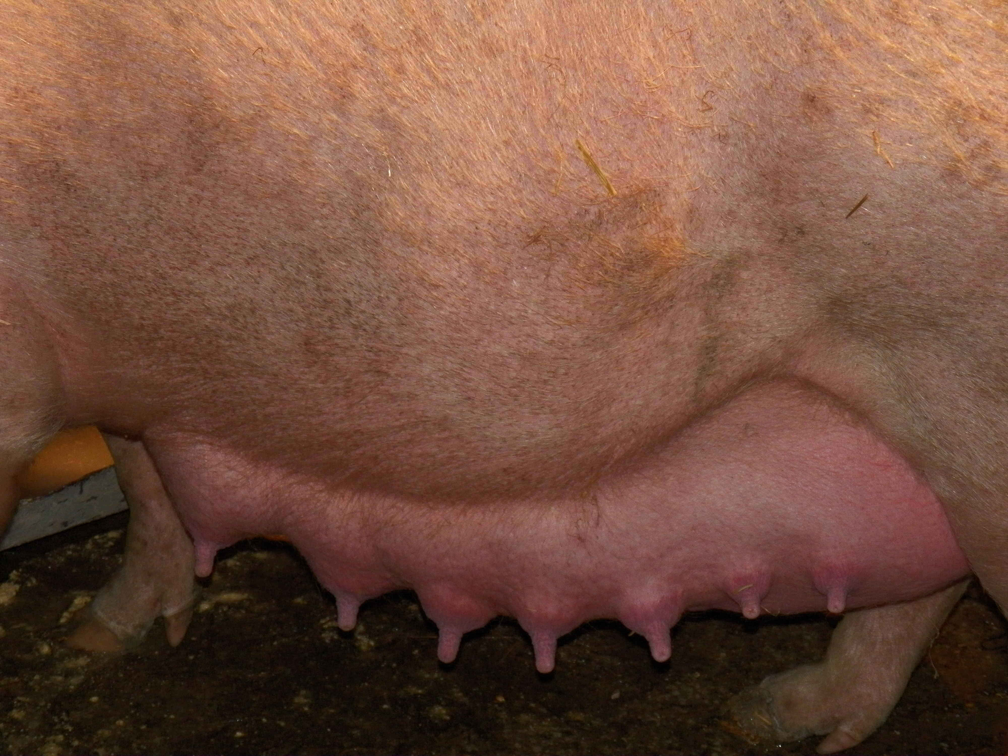 Sows are selected when they are small gilts (little girl pigs) One of the criteria is for her to have fourteen teats. I have had a sow give birth to fourteen once, but she only raised thirteen…I called them the “dirty dozen”, after all they were a “baker’s dozen”. 😮