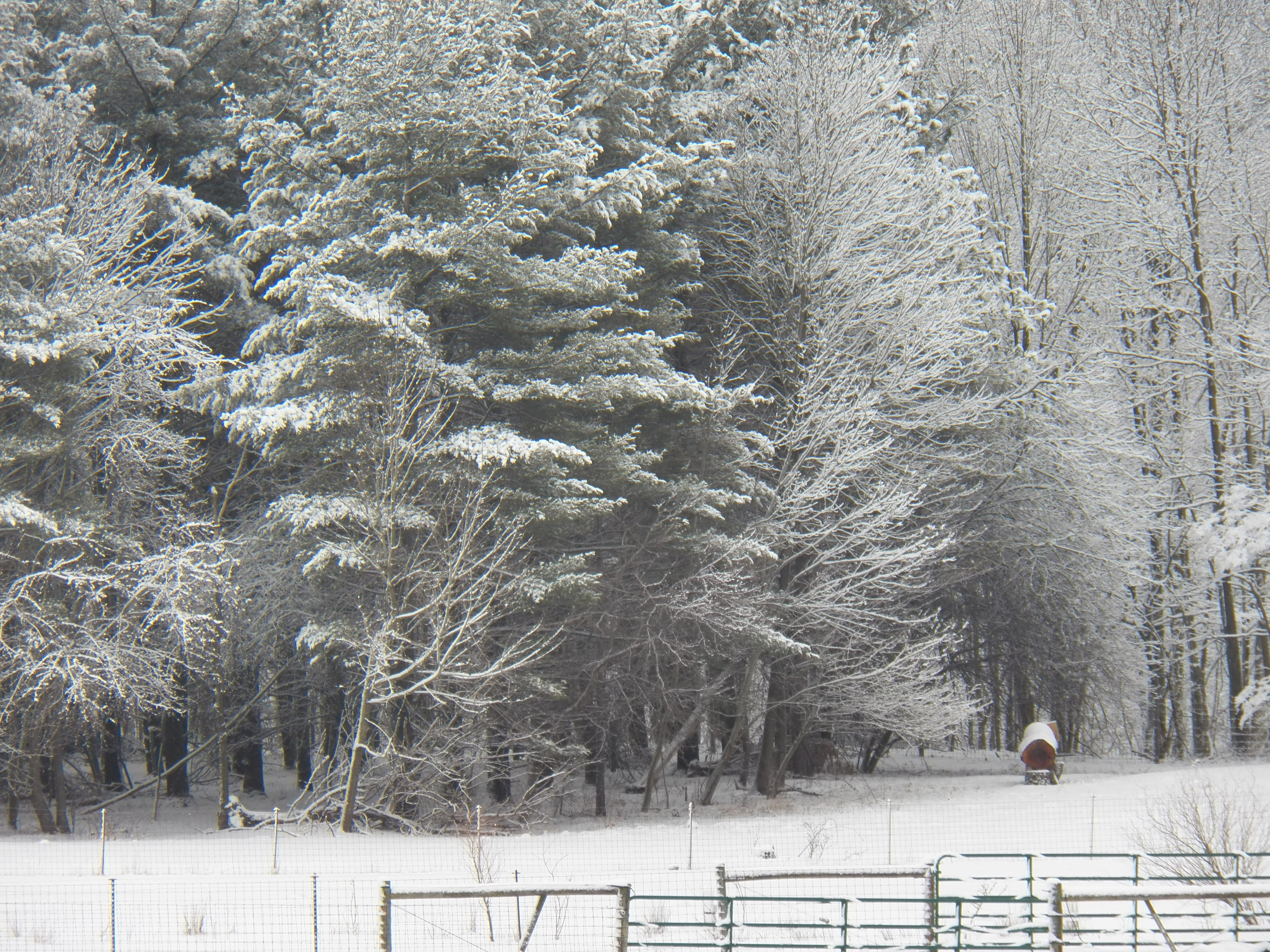 Freezing rain, followed by snow created this pretty picture yesterday morning. It was beautiful to see. The bee log rests in a sort of alcove in the white pines on the edge of the back pasture. The winds are less in that protected place. I hope the bee gals are all safe and doing well. I will know for sure in spring.