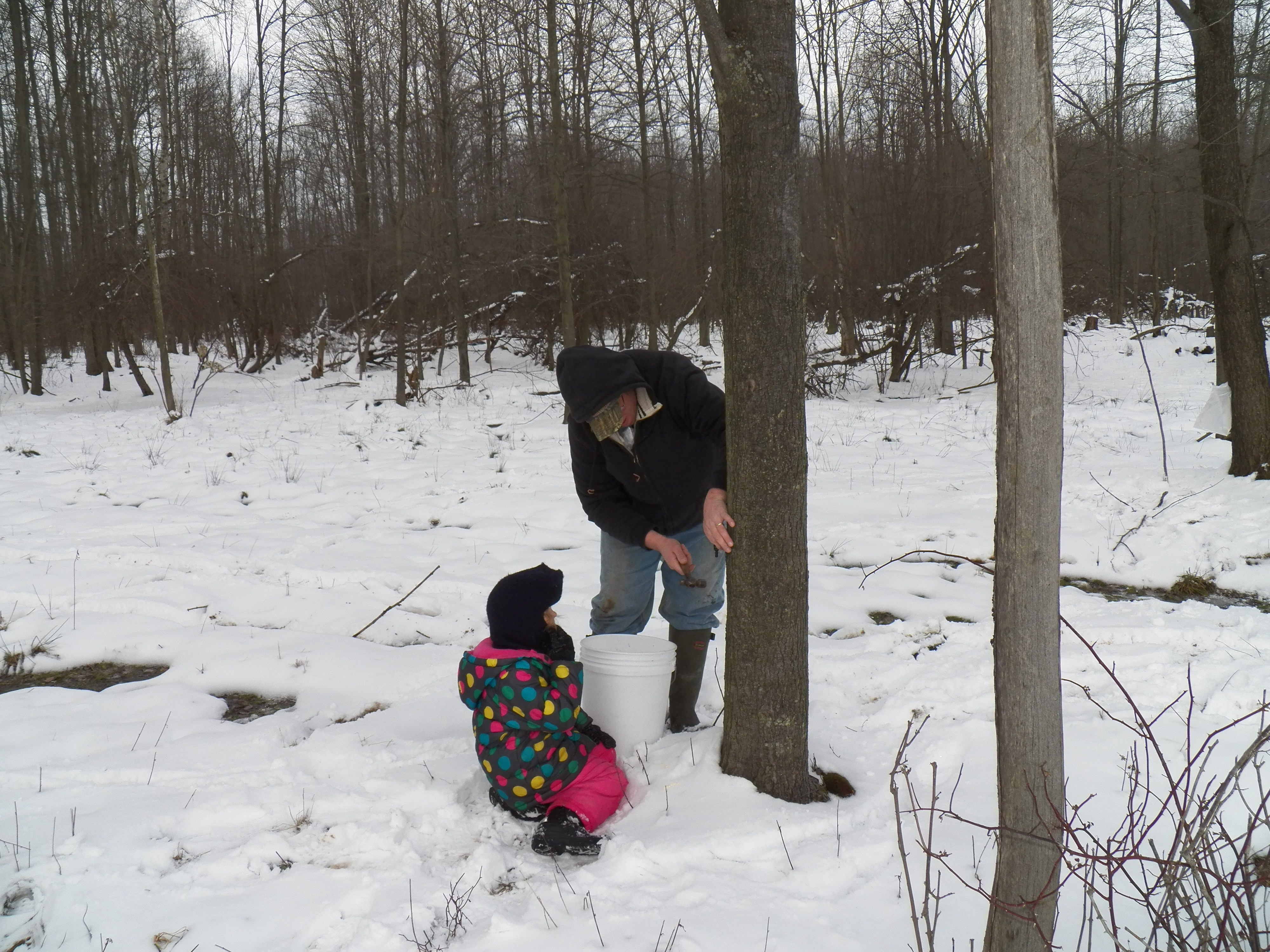 We tapped too early last year in a haste to get started. We didn’t even make any syrup that first warm up. All we did was sweeten the pans. We had to battle ice in our bags last year as the trees would dribble during the day and freeze at night. Then we would get a nice warm up, but our bags were already half full of ice…the bags couldn’t hold all the fresh sap. We learned a BIG lesson last year.