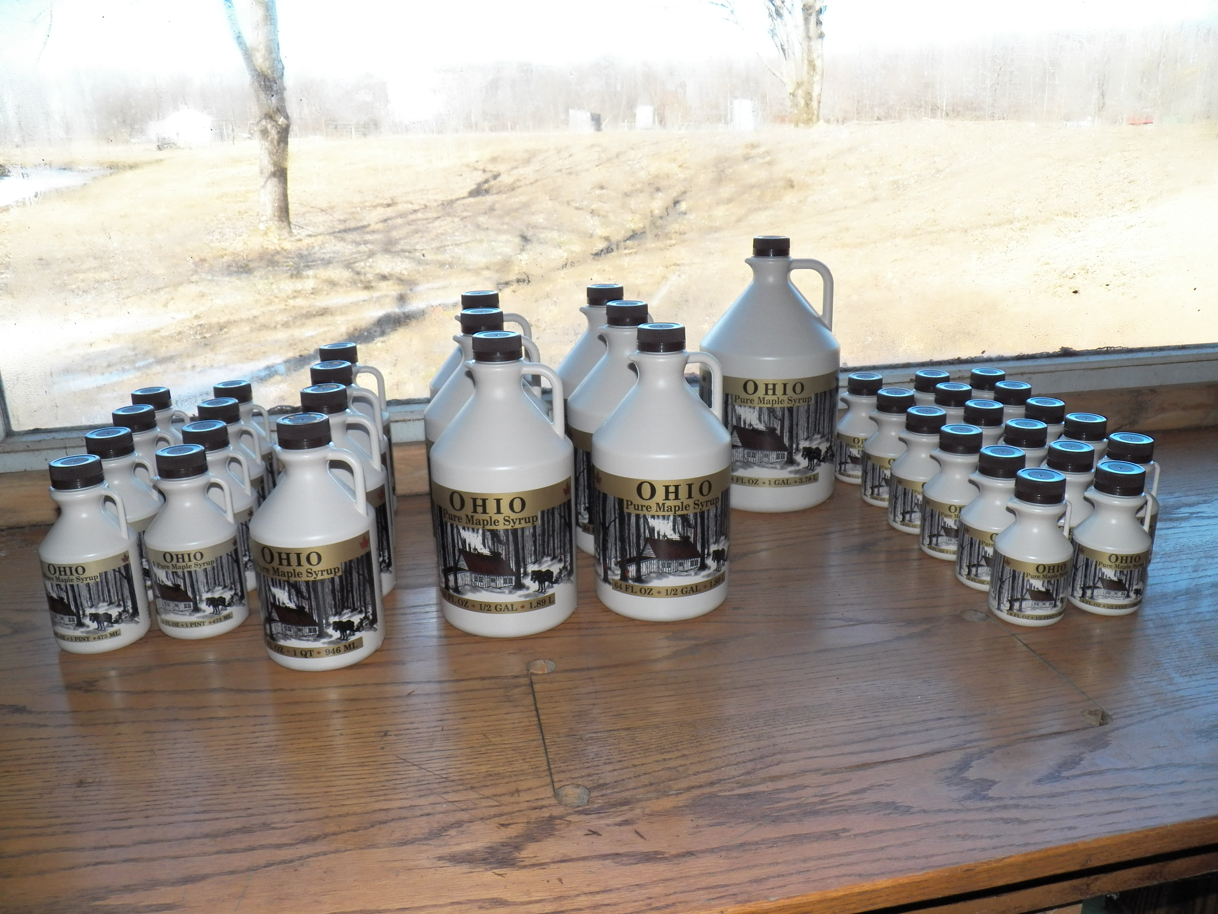 This is just a smaple of some of Ohio’s finest maple syrup. We bottle it in the sugarhouse on a canner just for that purpose. I like the containers that show off our great state. I am Ohio proud.