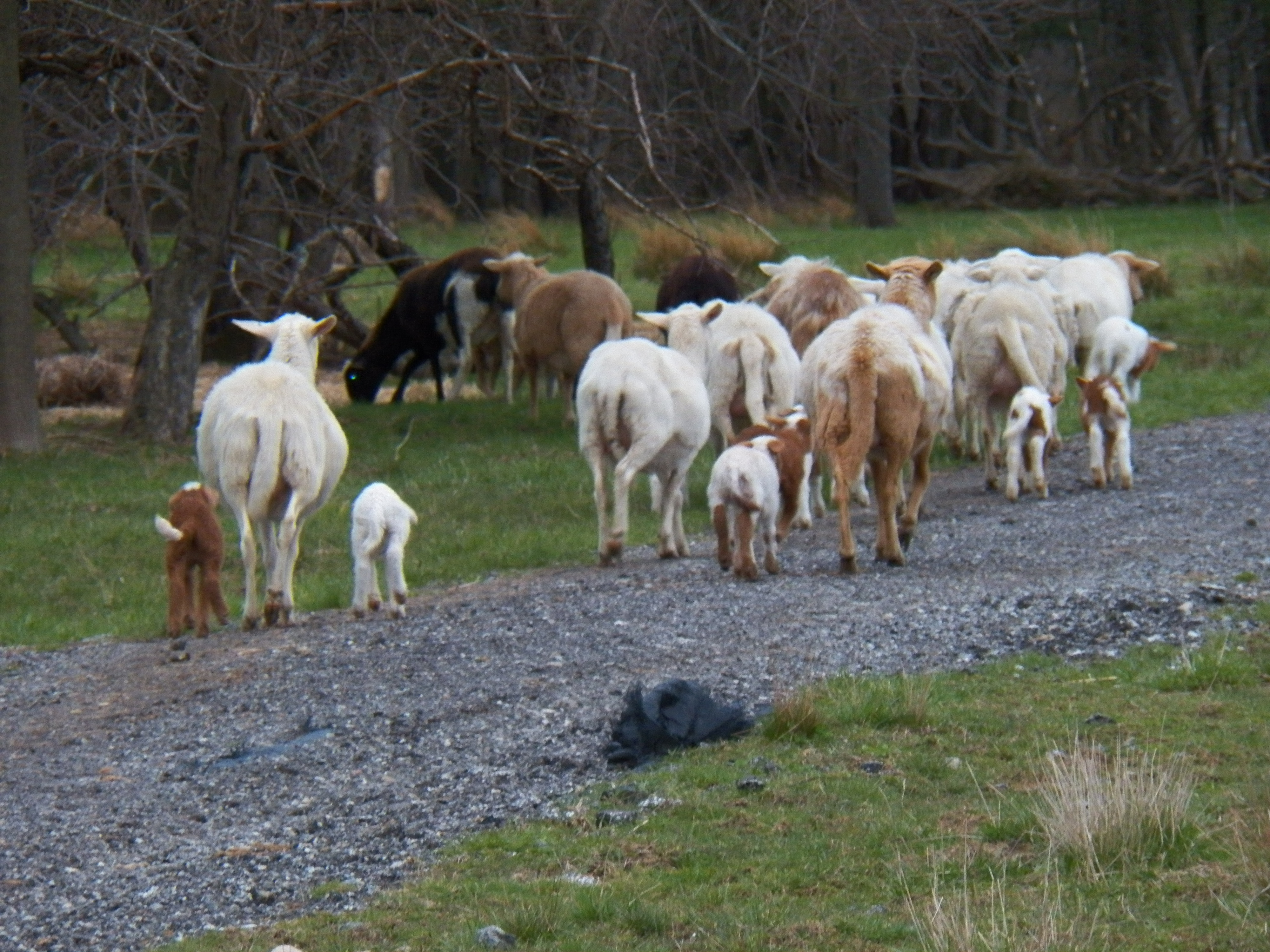 Once all of the sheep got the idea of what was happening, they followed along just fine. Once we got to the back lane, the mothers knew exactly where they were going. They walked right past me, paying me little attention… the babies? Well, they go where mom goes, at least for now. Independence will rule the lambs in a few weeks, but for now, they know that mom has all the answers and all the milk!!