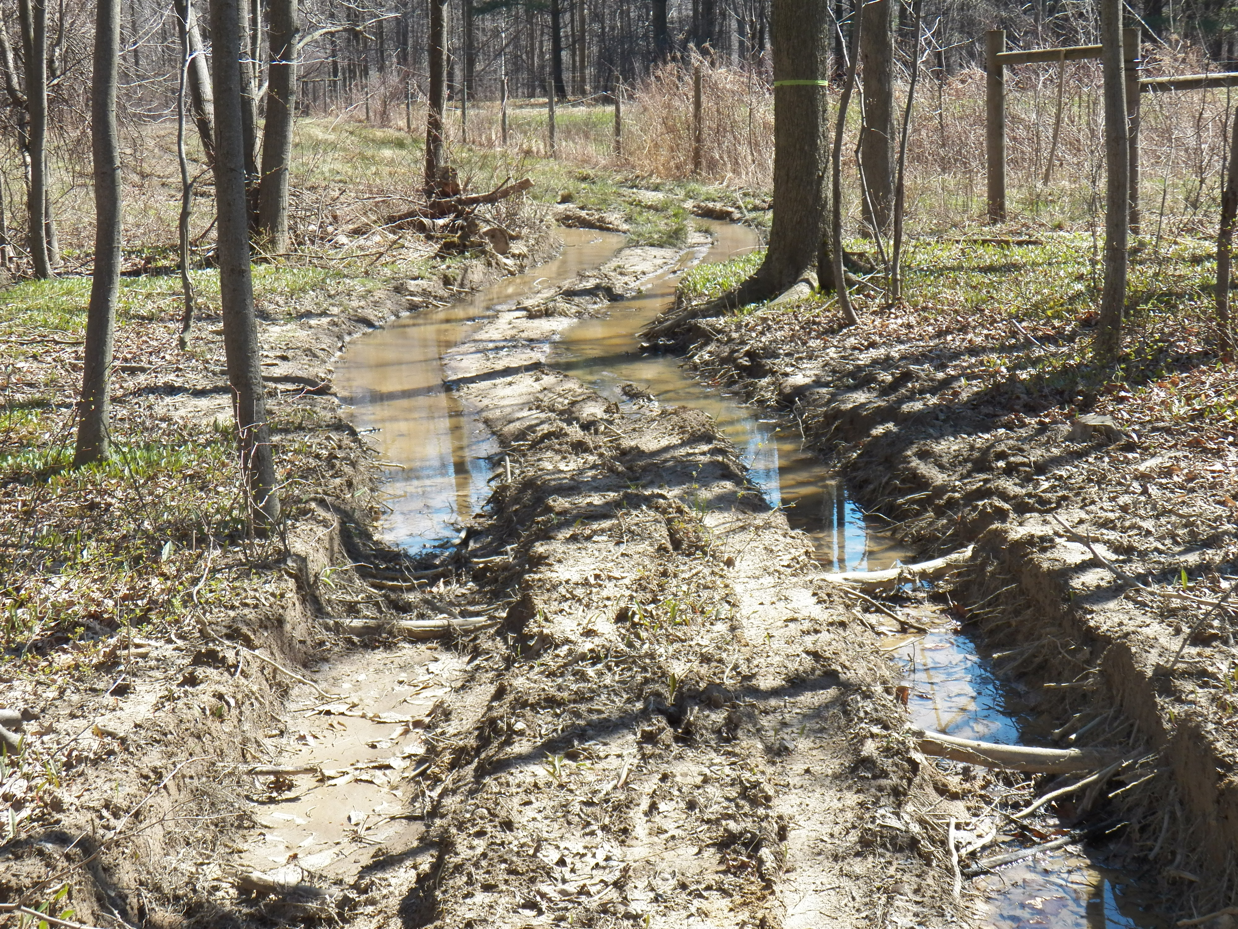 I have sorted out how to repair the road. We will drain the water and give it a place to go. A small dozer will then smooth the ruts back out. Lastly, I will banish the tractor from the woodlot unless conditions can support using it. Horses make very little impact on the land and forest, this is not the case for tractors.