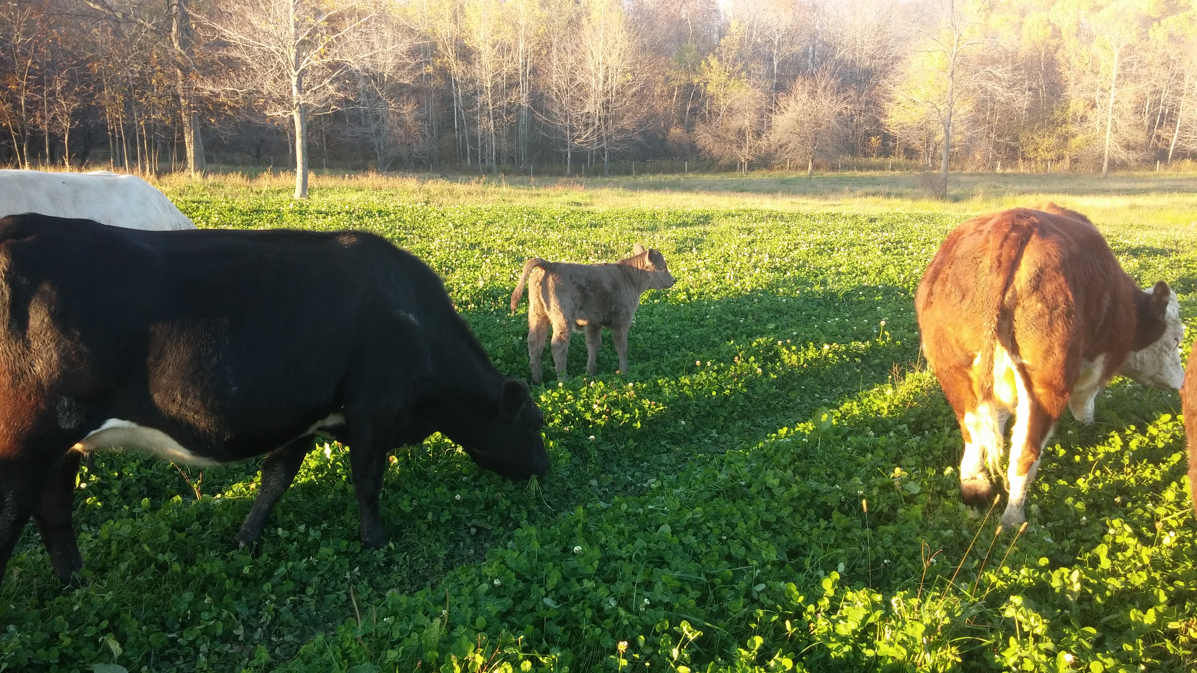 The little calf is 3/4 Murry Grey. She is standing right in front of mom and dad, but I focused on the cute one! The rich clover will help provide very rich milk to make the little one grow. She is a chunk. She is a fine example of what I hope my breeding program will accomplish. I haven’t named her yet, but all in good time I guess.